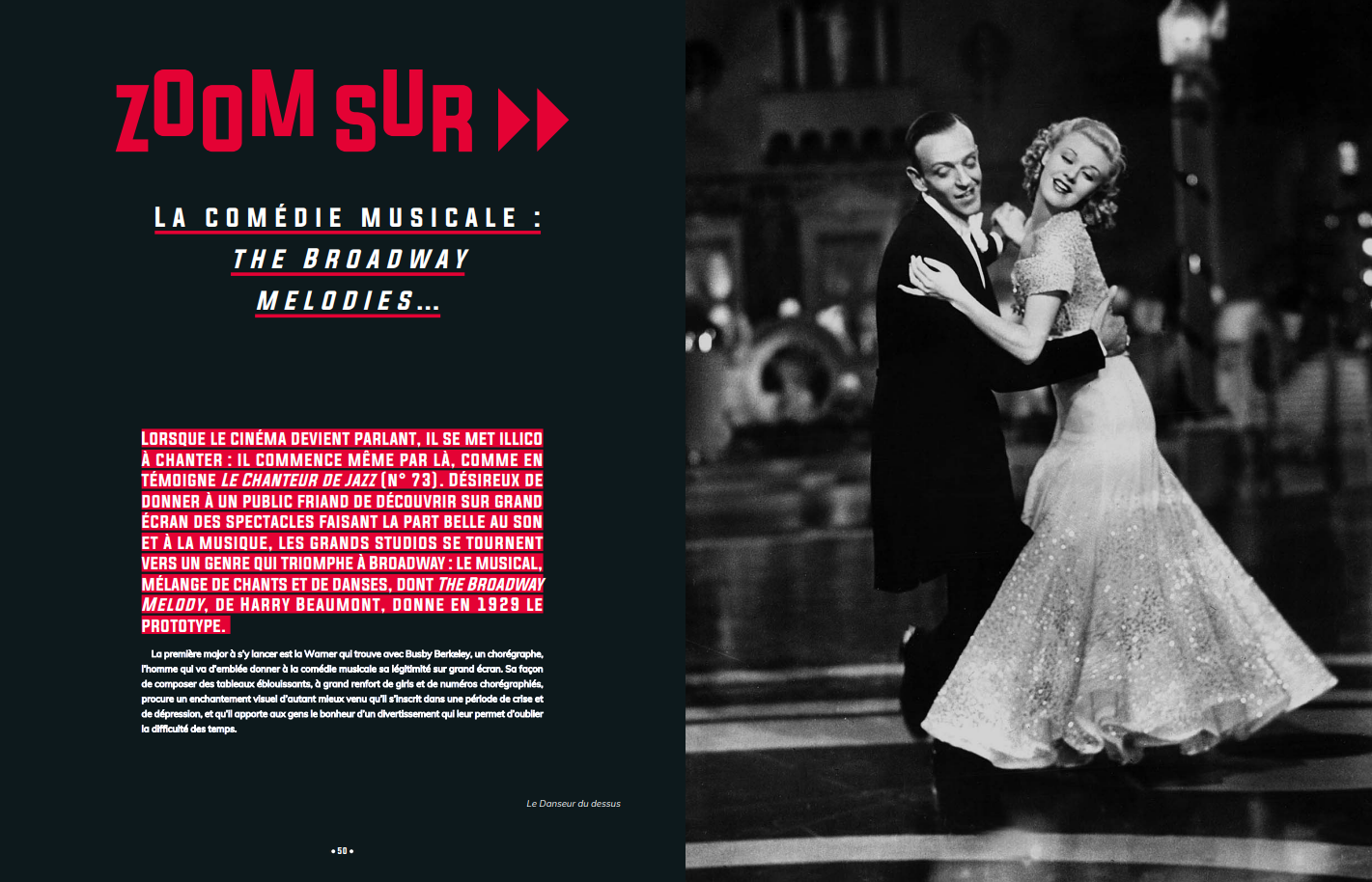 Chaque époque est succinctement présentée. Les grands enjeux de la période sont caractérisés (arrivée du parlant fin des années 20, numérique pour les années 2000, etc). Les « Zoom », qui émaillent la lecture, constituent la principale plus-value d’un catalogue qui manquerait de vie sans eux. Ces « Zoom » se focalisent sur des acteurs, des réalisateurs, des courants marquants, des films notables de la période. Ils font le sel de l’ouvrage, en approfondissement certaines œuvres pour être plus complet, sans basculer dans l’excès d’information : point de cours théorique ici. Par exemple, on a droit à un « Zoom » sur Marylin Monroe, qui retrace sa carrière par le prisme musical, et met en perspective le choix de rendre hommage à Rivière sans retour d’Otto Preminger.