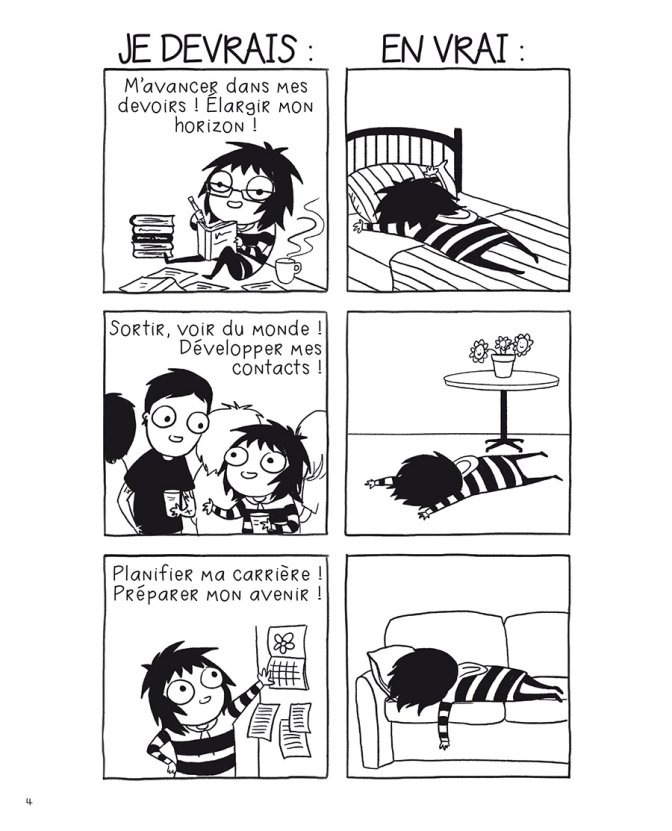 Sarah Andersen pourrait être comparée à une Pénélope Bagieu des Etats-Unis, en moins sociable. Tout en noir et blanc, le premier aperçu est mitigé, avec un aspect un peu barré, qui laisse imaginer les tracas quotidiens d’une jeune femme. Mais ces truculentes angoisses et ces petites joies ont toutes un fond de vérité qui parle à tout le monde, d’une manière très juste et très personnelle. Son blog (Sarah’s Scribbles) est reconnu dans le monde, partagé sur les réseaux sociaux et les sites de memes, avec un humour cinglant, parfois un peu crû, souvent touchant, qui tient en une planche de cinq cases simples et efficaces. Introvertie au possible, la personnage principale a peur de grandir et de se socialiser, mais ses doutes ne l’empêchent pas de partager ses moments de panique, abordant également des sujets pertinents, comme la douleur de la menstruation ou le ciment des relations. Du coup, certains gags sont presque très sérieux, avec quelquefois un décalage qui peut s’expliquer par la traduction de jeux de mots anglais difficiles en français. Car ce petit tome aurait presque mériter d’être publié par Delcourt sans traduction VF, tant les expressions salement ironiques dans la bouche du petit personnage sont vivantes en VO. Il n’empêche que tout le monde sourira devant ces chroniques cocasses d’une routine et de l’apprentissage de la vie adulte.