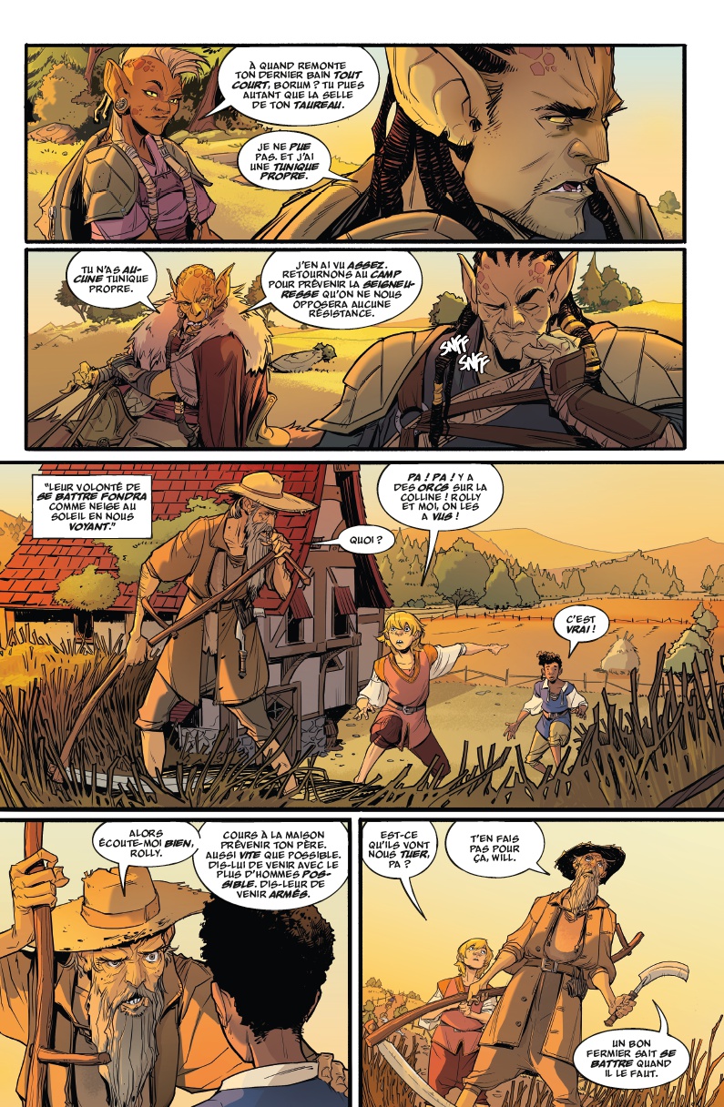 Pour accompagner cette intrigue plus complexe qu’il n’y paraît, un dessin soigneux et appliqué compose un monde qui se délite et des personnages qui s’allient. Dès les premières pages, cette idée de crépuscule s’impose alors qu’il n’y a même pas encore de paysage nocturne, mais c’est la signification profonde qui se détaille. À travers les regards lourds, les soupirs, les yeux baissés, autant de petits détails qui figent des personnages par ailleurs très beaux, fluides et d’une élégance guerrière certaine, faisant apprécier une geste épique des plus distinguée. Lorsque paraissent enfin les ennemis, ces Vangols, on retrouve une sorte d’Elfes nocturnes qui auraient acquis quelques griffes de cauchemar, mais on les oublie rapidement pour se concentrer sur les flashbacks dans les souvenirs des palais orques, finalement plus prenants et plus percutants.
