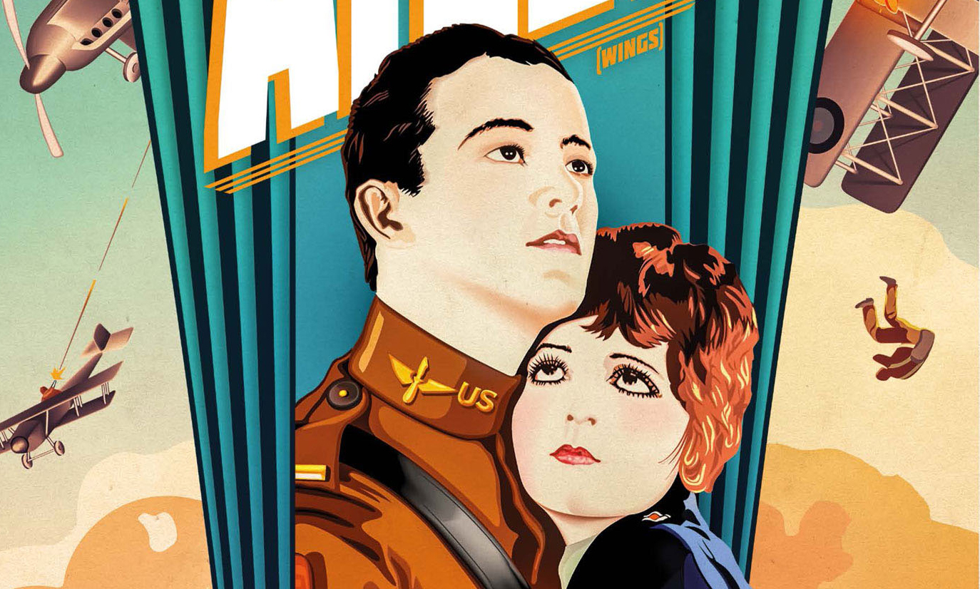 Le film : Après le succès de La grande parade (K. Vidor, 1925), produit par la MGM, la Paramount Pictures voulut elle aussi entreprendre une superproduction d’action sur le thème de l’aviation. Le film fut réalisé avec un budget de 2 millions de dollars, certains frais étant minimisés du fait que les deux jeunes acteurs, Richard Arlen et Charles ’Buddy’ Rogers, pilotaient eux-mêmes leurs appareils. Bénéficiant d’une équipe technique et artistique de prestige, dont Edith Head pour les costumes, le film mélangeait récit de guerre, romance et aventures. La première officielle eut lieu le 12 août 1927 à New York mais le film connut d’autres sorties en 1928 et 1929. C’est qu’entre temps, le cinéma parlant avait fait son apparition. De la musique jouée à l’orgue et des effets sonores furent ajoutés avec le procédé d’enregistrement Photophone. Les ailes est resté célèbre pour avoir été l’œuvre ayant remporté le premier Oscar du meilleur film, en plus de celui des « meilleurs effets d’ingénierie ». Ce fut un triomphe personnel pour William A. Wellman, jeune réalisateur qui deviendra un petit maître de Hollywood avec des réussites comme L’ennemi public (1931) ou L’étrange incident (1943). Clara Bow consolida son statut de star de la fin du cinéma muet, quand Gary Cooper fut remarqué dans un court second rôle. Le reste de la distribution comprenait d’autres acteurs importants du muet, dont la jeune première Jobyna Ralston, le vétéran Henry B. Walthall (ex-interprète de Griffith), et Arlette Marchal, une vedette française. Le film ressort dans les salles le 5 novembre dans une version restaurée redux.
