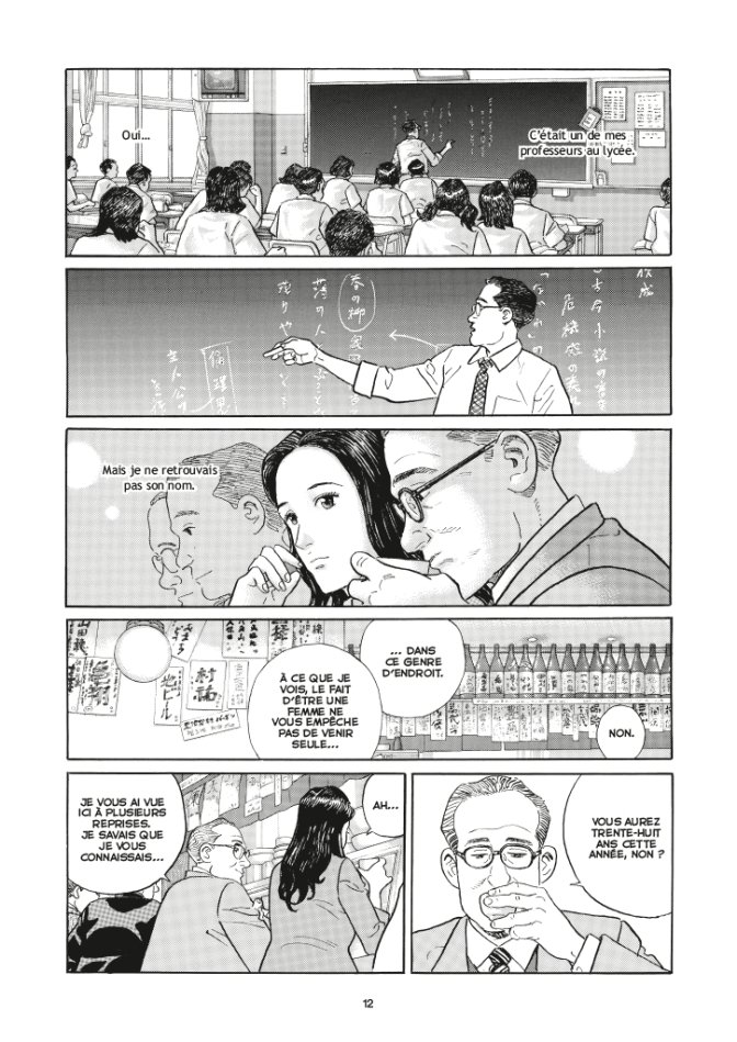 Critique : Exemplaire avec ses histoires originales, Jirô Taniguchi savait aussi être impérial de maîtrise lorsqu’il se lançait dans une adaptation de roman en manga. Avec Les années douces, il s’agissait d’un roman de Hiromi Kawakami, un classique de la littérature nippone par sa justesse, sa délicatesse et son immobilisme permanent. Au moment de l’adapter, Taniguchi a sans aucun doute décelé que le ton et le rythme du roman allaient coller à son style, cette romance faite de deux solitudes étant un modèle du genre, traité avec lenteur et sans passion, avec clarté mais sans brillant. En effet, aucun des deux personnages principaux n’étant particulièrement expansif ou entreprenant, c’est avant tout une histoire d’amitié et d’écoute qui se déroule dans cet album. De fait, les rares moments de jalousie étant plutôt implicites, et les pensées de Tsukiko étant toujours très pures. Pas de scandale, pas de drame, les rebondissements n’arrivent pas à de franches hauteurs, mais c’est plutôt le calme et la franchise qui s’imposent pour faire en sorte que ce récit soit remarquable.