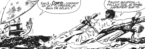 Dans La Ballade de la mer salée, Corto apparaît pour la première fois en bien mauvaise posture, attaché les bras en croix sur un radeau de fortune, et dérivant dans le Pacifique, au large des îles Fidji. Il est repéré par Raspoutine, qui a déjà recueilli les deux jeunes cousins Pandora et Caïn Groovesnore – les deux personnages centraux de la Ballade –, dont le yacht a fait naufrage un peu plus tôt. Les deux hommes, qui pratiquent la piraterie pour le compte du mystérieux « Moine », s’envoient des noms d’oiseaux, mais Raspoutine libère l’infortuné marin. Nous sommes en 1913, à la veille de la Première Guerre mondiale, qui touche également le Pacifique Sud, puisque Britanniques et Allemands ont des possessions dans la région. Pratt ancre ainsi son récit dans l’histoire, mais dans un espace suffisamment lointain pour éveiller l’imaginaire de son lecteur et conserver une certaine liberté dans sa narration.