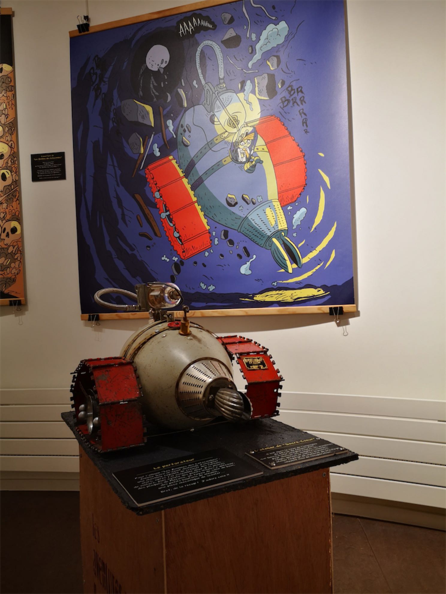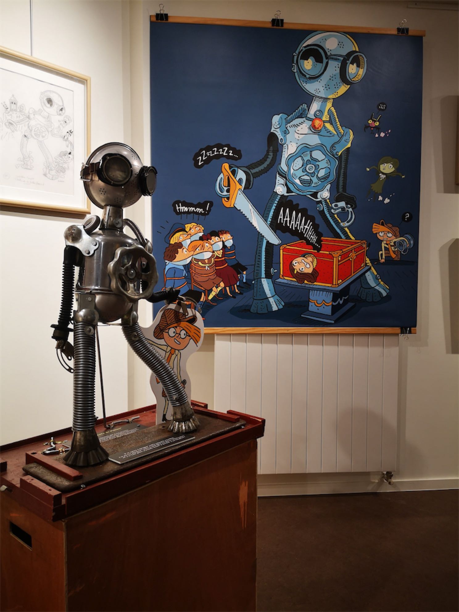 Il existe actuellement douze albums de la série et une vingtaine de machines ont été construites pour ces albums précisément. Dans l’exposition et pour que ce soit amusant pour les enfants j’ai dû fabriquer une douzaine de machines supplémentaire qui elle sont faites pour être manipulées par les visiteurs (enfants et adultes) : avec des manivelles, des systèmes où l’on enfonce ses mains puis jaillit de l’électricité, de la fumée… il se passe plein de choses. Le visiteur est totalement plongé dans cet univers de Paris en 1900, il peut essayer les machines et c’est cela qui rend l’exposition ludique.