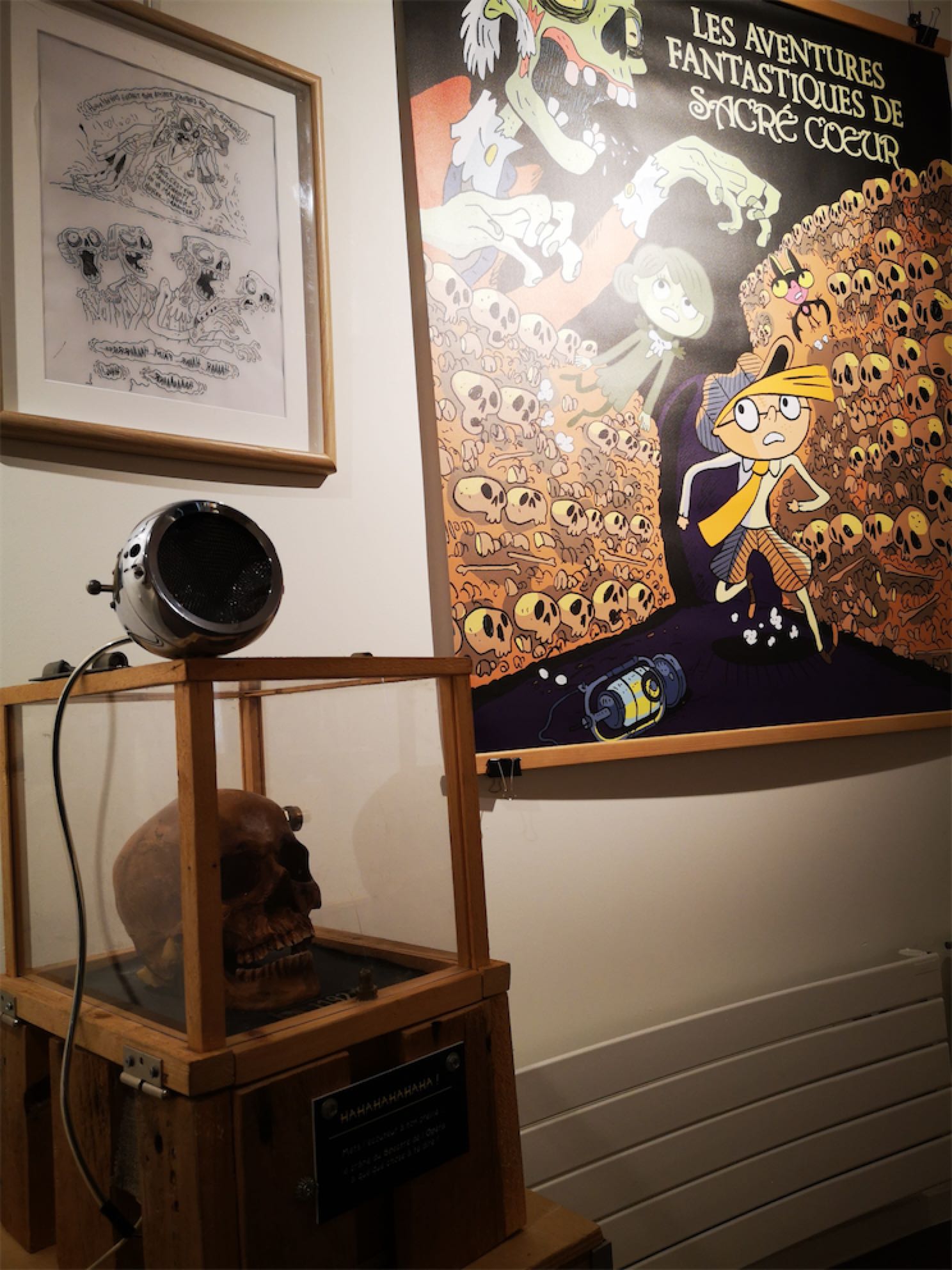 Il y a par exemple le crâne. Pour faire l’album Le spectre de l’opéra j’avais acheté un crâne très réaliste mais en résine, et une fois le livre terminé je l’ai motorisé et dorénavant il est articulé, il bouge tout seul dans l’exposition. Il se trouve dans une caisse, qui rappelle la momie de Rascar Capac dans Tintin, équipée d’un système audio donc lorsque l’on colle son oreille on peut entendre le crâne nous parler.