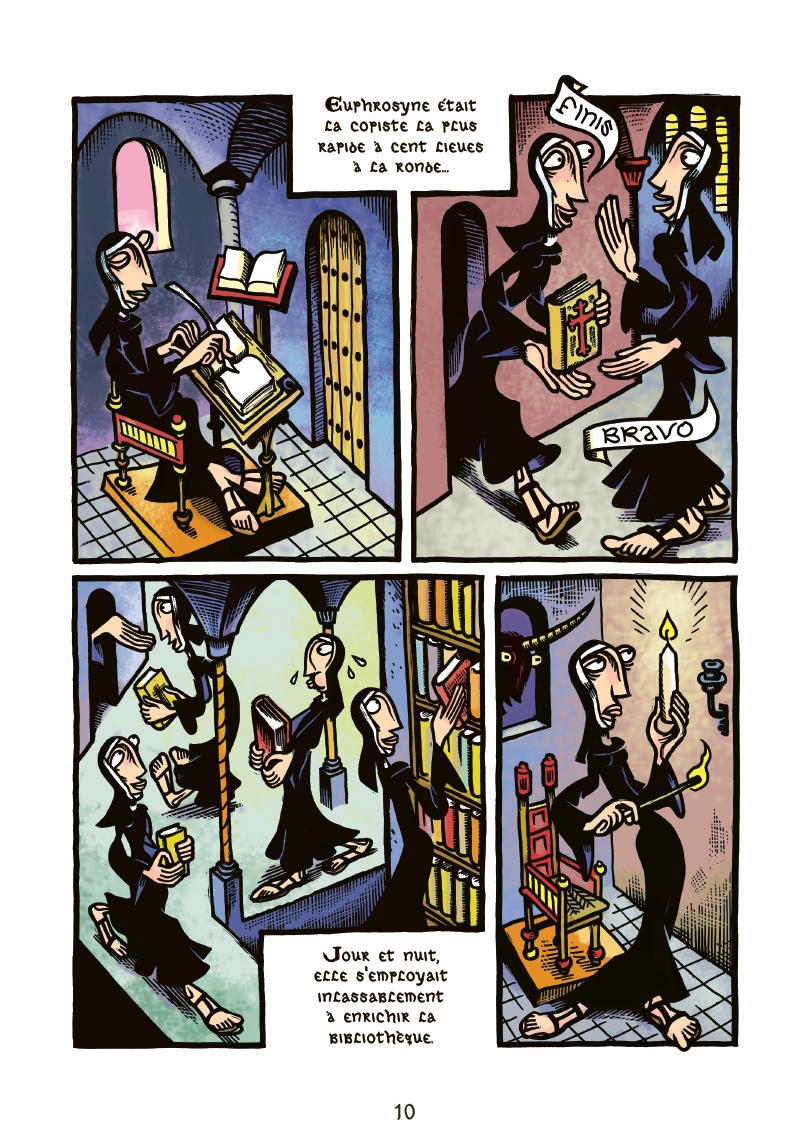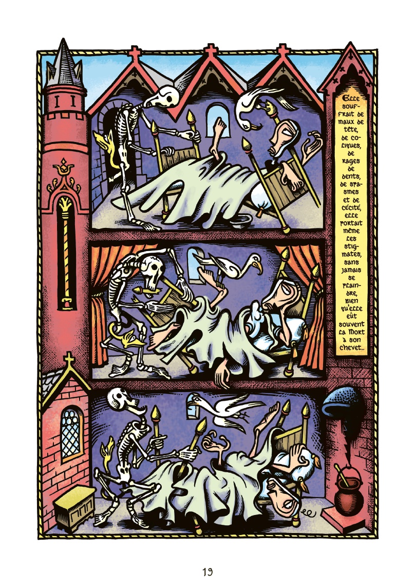 Le dessin et le narratif – avec ses chutes abruptes – de Marcel Ruijters s’avèrent particulièrement inventifs et originaux. L’artiste caricature volontiers ses personnages, et emprunte habilement à l’art de l’imagerie – images d’Épinal, images édifiantes – pour donner vie à ses scènes, sans perdre son sens du décalage. La palette chromatique variée, qui s’écarte volontiers du réalisme, vient nourrir l’imaginaire médiéval. Enfin, l’objet livre est à la hauteur du récit : la couverture de l’album est percée de manière à former un vitrail, au sein duquel on distingue différentes « bienheureuses ». Un livre à mettre entre toutes les mains des amateurs de l’époque médiévale.