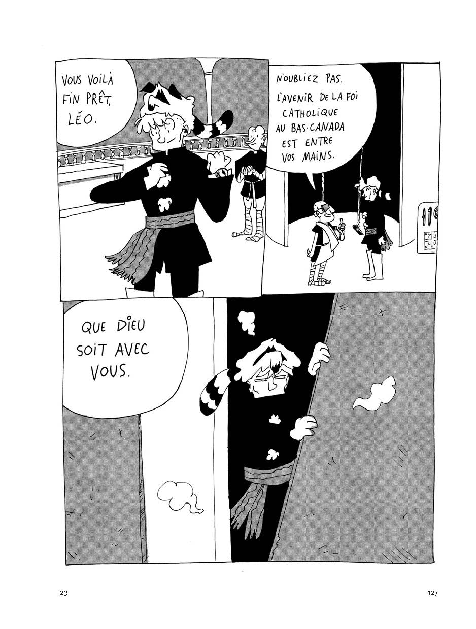 Résumé : Satan et ses compagnons diaboliques ont commencé à pactiser avec des humains. Ensemble, ils se sont mis à faire des concours de canots volants au-dessus des bourgs auparavant paisible et pieux du Québec. Tout part en désordre, à tel point que le pape décide d’envoyer l’un de ses meilleurs agents en mission, Leo Benedictus Julius Agapet. Cet envoyé pontifical a pour but de s’infiltrer parmi les hérétiques et de faire la lumière sur la situation pour trouver une solution d’un retour à la normale. Ce jeune agent secret parvient à intégrer une des équipe, celle de Corbella Diesel, une sorcière qui a de la gouaille, bien décidée à remporter la course et obtenir la somme d’argent promis au vainqueur pour finir sa vie tranquille dans une cabane en Gaspésie. L’agent joue si bien son jeu qu’il prend goût à ces canots volants… mais comment cette histoire va finir ? Telle est la mission de deux créateurs de bande dessinée que l’on croise au début de l’histoire : ils doivent trouver une fin à cette histoire épique, diabolique et drolatique ! Une mise en abîme du travail d’auteurs de bande dessinée doublé par une incarnation de la narration sous la forme d’un castor ! I Une lecture aussi sucrée que le sirop d’érable et qui en devient enivrante si on le consomme sans modération ! Attention, ça dépote !