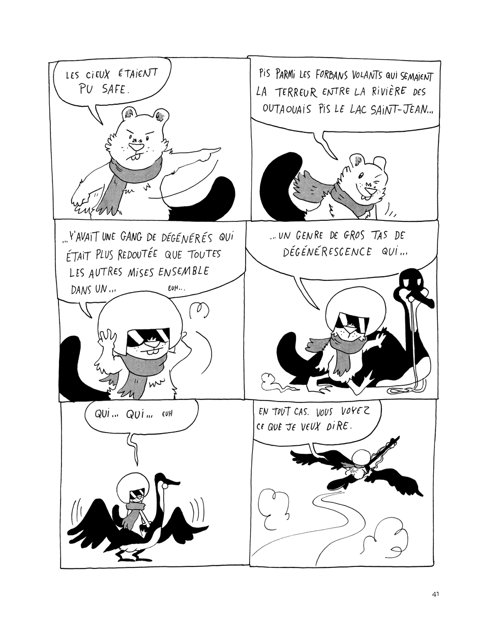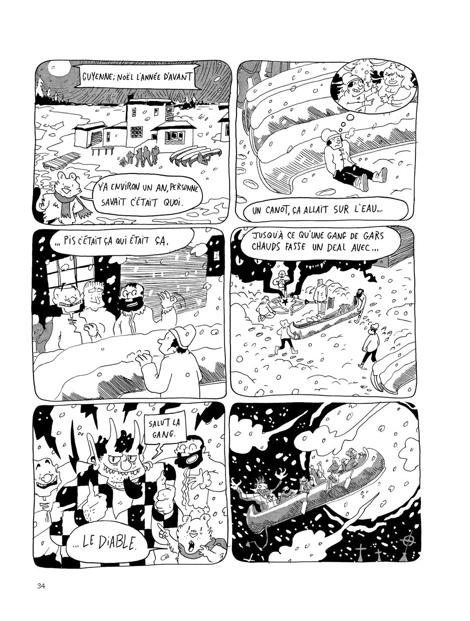 Cette histoire est aussi truffée d’expressions québécoises savoureuses ! Logique, direz-vous, elle est écrite par des québécois… Les premières pages peuvent être un peu obscures pour un Français non habitué à cette langue francophone mais au fur et à mesure nous nous y habituons et cela donne d’autant plus de piquant et d’humour au récit ! Le dessin de Xavier Cadieux est très enlevé. Un dessin en noir et blanc avec par ci et par là quelque aplats de noirs. Son trait est sacrement dynamique, dépouillé, mais aussi un peu grotesque. Son imagination créative donne vie sur le papier à tout une série de diablotins aussi loufoques que grinçants. Les personnages ont des looks bien trouvés qui permettent de les reconnaître facilement parmi la foule de personnages figurants. Il sait aussi jouer avec les proportions et invente un univers fantastique et rustique en usant encore une fois de détournement de quelques topiques québécois, comme les cabanes de trappeur ou la vie souterraine pendant les longs hivers du nord.