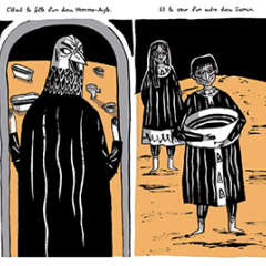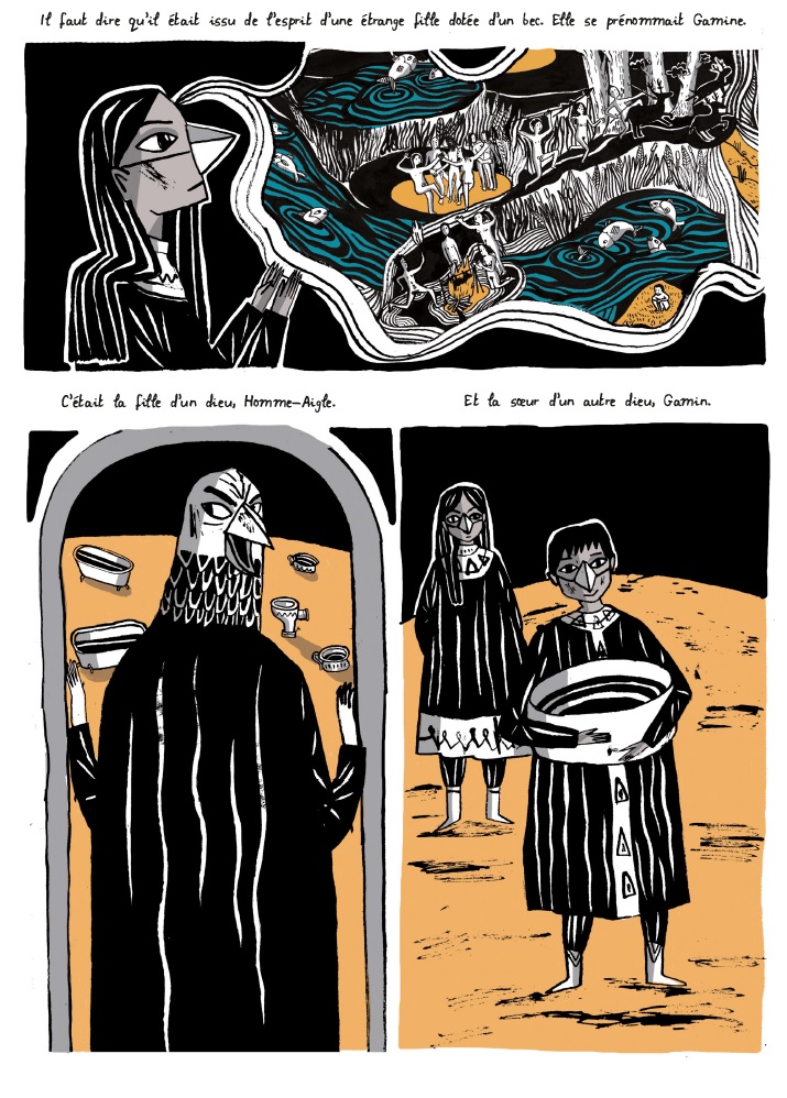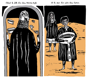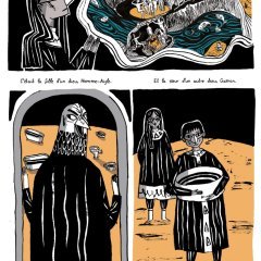 Dans cet extrait, on retrouve la pertinence et le sel qui fait de cet ouvrage un conte moderne s’appuyant sur les faiblesses des anciens contes. Quand on parle de faiblesses on évoque avec un malin plaisir la place des femmes par exemple et de nombreuses caricatures sociétales qui n’ont plus aujourd’hui leur place. Isabel Greenberg, dans son style graphique et scénaristique marqué, nous livre ici la palette complète de son talent. A la fois grinçant et sarcastique, ce conte plongera les lecteurs adultes dans une grande réinterprétation des Mille et Une Nuits avec son lot d’histoires improbables, de personnages atypiques, de scènes caustiques, un bien bel ouvrage.