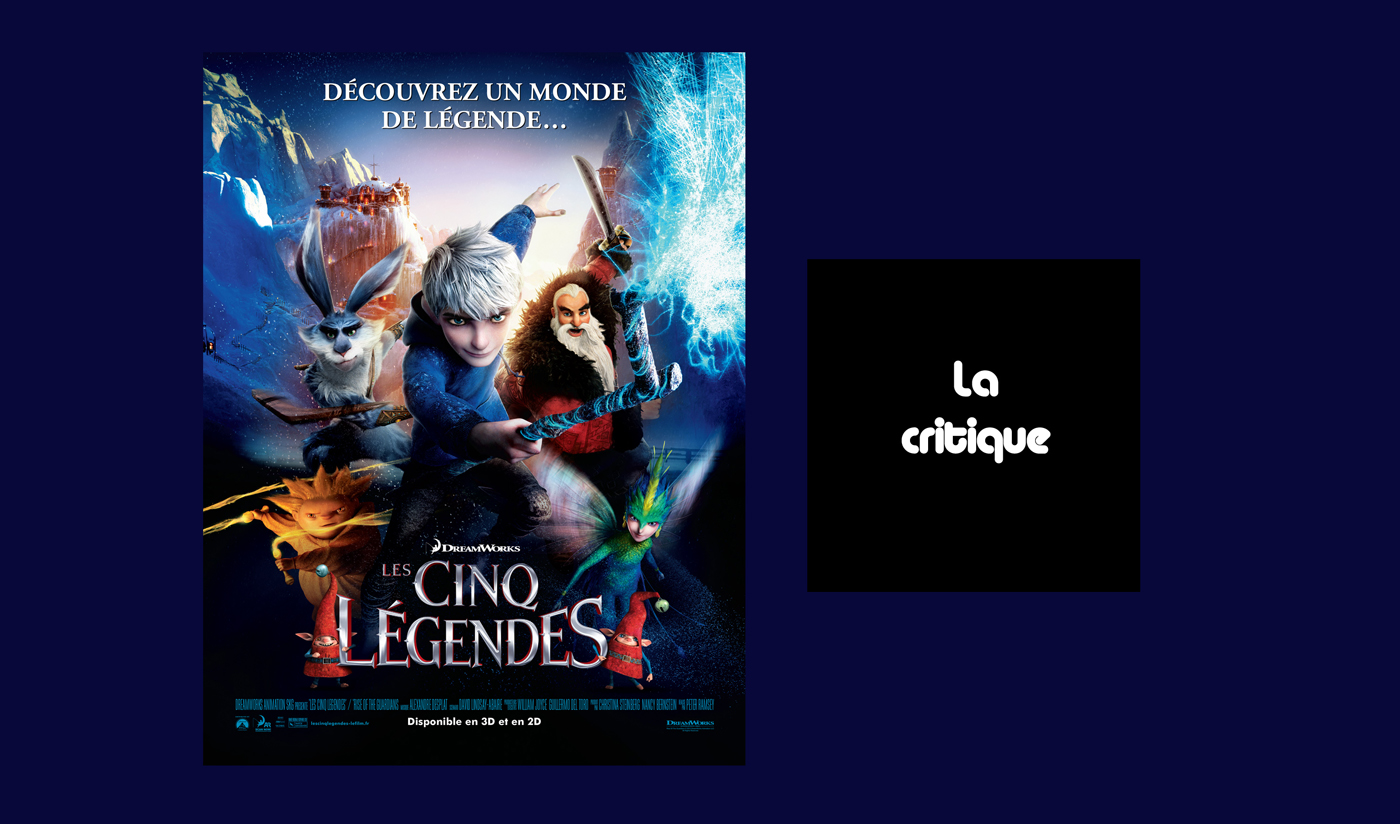 Résumé : Les Cinq Légendes raconte l’aventure fantastique d’un groupe de héros, tous doués de pouvoirs extraordinaires. Lorsque Pitch, un esprit maléfique, décide de régner sur le monde, ces 5 légendes vont devoir, pour la première fois, unir leurs forces pour protéger les espoirs, les rêves et l’imagination de tous les enfants.
