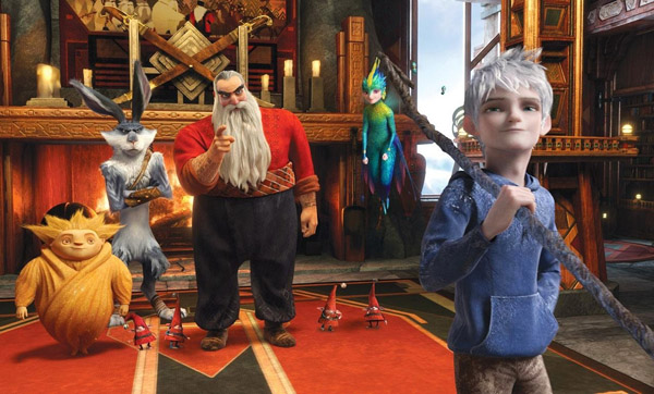 Un père-noël russe tatoué à la Mitchum (Gentil sur le bras gauche, Méchant sur le droit), un lapin de pâques manifestement australien, une fée-tichiste des molaires de lait obsédée par le fil dentaire, et un esprit du verglas en hoodie, coiffé façon Vivelle dop effet écorche-mur…Non, Dreamworks ne pouvait décidemment pas ravaler la façade de son fond de commerce en reniant tous ses fondamentaux. Quitte à virer candide et mettre un pied frileux dans le premier degré, son casting se devait de passer par la machine à dévoyer les mythes qui avait déjà tant servi l’obèse scatophile de Shrek et sa horde de légendes dégénérées. Seul le marchand de sable (du reste le plus intéressant) échappe au phénomène. A l’heure de questionner la validité et la fonction de personnages scellés dans un imaginaire collectif aux senteurs naphtalines, cette réappropriation ne manque cependant pas de sens (à part le croquemitaine, qui porte désormais un nom de brioche) mais plutôt de chair. Embarqués dans un récit pressé de nous faire visiter leurs chez-eux comme on traverse les sections thématiques d’un parc d’attractions (Le fabuleux monde du père noël, les merveilleuses galeries du lapin, l’incroyable palais de la fée des dents), les membres de la A-team de l’émerveillement infantile sont définis, avant tout, par leurs accessoires (un accent, une arme, un entourage), comme la première blogueuse mode venue. Certes, cette histoire est d’abord celle de Jack Frost (Le Mister freeze des mineurs), mais rien de tangible (ou quasiment rien) ne nous permet de croire à l’épaisseur de ses acolytes. C’est tout de même dommage, pour un film sur la suspension d’incrédulité qui prétend humaniser ses monolithes (on peut humaniser un lapin).