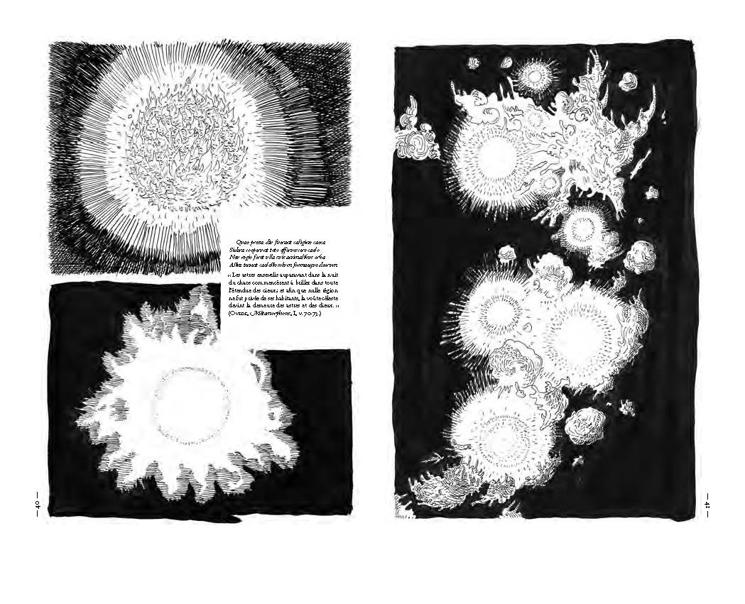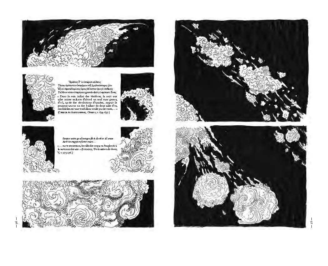 Mais d’Hésiode à Pline en passant par Virgile, c’est bien l’imaginaire des Anciens que Hyacinthus convoque dans Les Cosmogoniales. L’artiste a sélectionné des extraits de textes – poèmes, traités d’histoire naturelle, pièces de théâtre – qui expriment la manière dont les auteurs gréco-romains se représentaient la naissance du monde. Ces extraits sont représentés à la fois dans leur version originale grecque ou latine et dans une version traduite remaniée par l’auteur. Cette confrontation entre sagesse des auteurs antiques et représentation graphique contemporaine de la naissance du monde s’avère la plupart du temps fructueuse. Certains passages des Anciens, en particulier ceux de Lucrèce, sont saisissants de vérités, avec des intuitions géniales. Par ailleurs, la poésie de ces textes antiques apparaît sous un nouveau jour lorsqu’ils sont confrontés aux magnifiques planches de l’artiste. Il s’agit là d’une manière de redécouvrir ces textes autrement qu’en achetant une édition des Belles Lettres… Le trait de Hyacinthus est magnifié par la très belle édition en grand format cartonné avec dos toilé que propose son éditeur, Rue de l’Échiquier.