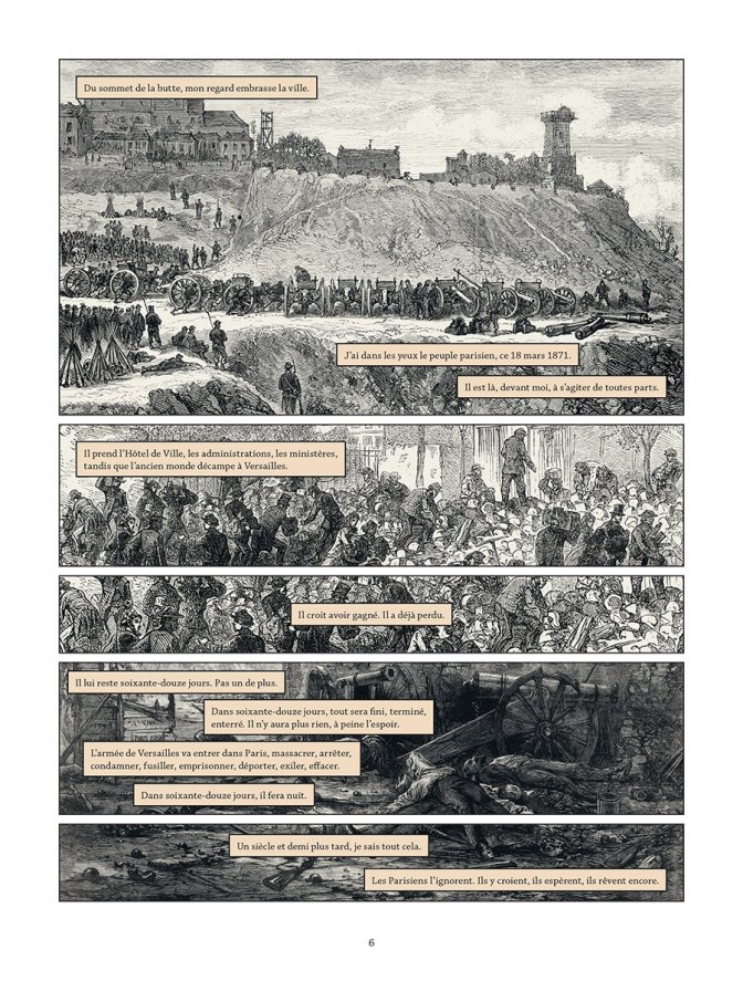 C’est dans la forme que réside la plus grande preuve du talent de l’auteur, qui fait revivre des gravures en autant de décors griffés, de personnages en forme d’exemples, de gros titres hachurés... Ce gigantesque collage est un travail d’orfèvre des pages jaunies, de découpeur et de restaurateur d’un passé et d’archives. Fascinant par son dessin caractéristique d’une époque, donc décalé avec notre époque, Les Damnés de la Commune s’impose ainsi comme une fresque à la fois vintage et historique, du début à la fin.