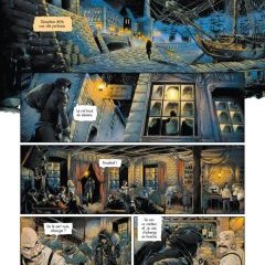 Les couleurs claquantes déchirent la nuit d’un halo de lumière orangée, la mer oscille entre des verts et des bleus qui n’inspirent jamais confiance. Mais de toute façon, comment la mer peut-elle inspirer confiance ? Les compositions s’étalent en de grandes cases, débordant des limites et dévoilant des angles de vue intrigants, des plans larges sur le bateau, ses mâts, sa coque, son équipage.