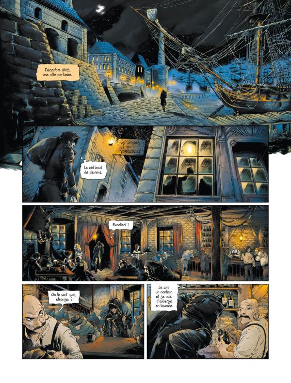 Résumé : {Les damnés du grand large} débute dans une auberge en 1809, avec un étrange conteur qui commence une histoire inquiétante, se déroulant en mer, vingt ans plus tôt. Un équipage affronte une tempête, des hommes meurent, marqués d’un étrange A sur le front. Meurtres mystérieux, commis par un être humain ou par une créature surnaturelle ?