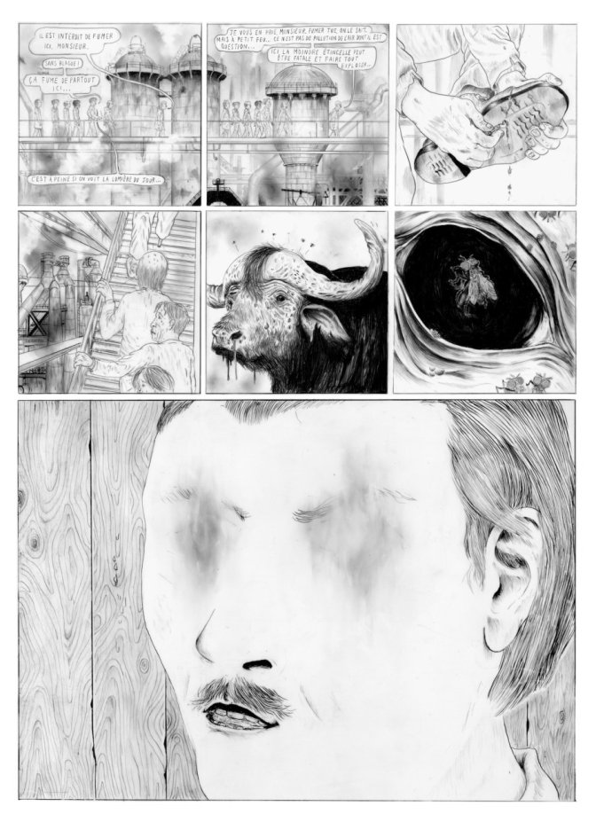Ce travail graphique, d’une très grande richesse visuelle, s’accorde particulièrement bien à l’altérité des personnages qui hantent le récit. L’auteur nous présente des gueules cassées de l’industrie, déformées par le travail mais surtout par la nocivité des produits chimiques qui suintent de toutes parts dans ce sinistre complexe. L’ambiance lourde et glauque de cette usine transforme les hommes qui deviennent des monstres, du moins perdent progressivement leur humanité, celle-ci se trouvant par trop altérée. Cette intégrité se délite principalement sur le plan physique, la morale préservant une certaine consistance entre ces damnés, alors que du côté des patrons, la notion d’éthique se trouve évidemment bafouée, totalement absente de ces pages, offrant une moralité nécrosée, viciée, à l’image de l’exploitation industrielle qu’ils provoquent par leur négligence. À travers ce récit de catastrophe, Setola développe ainsi une histoire aux accents politiques très prononcés. Il nous emmène avec ces pauvres ouvriers au fin fond de l’enfer productiviste et chimique dans une lecture presque suffocante où le charnier industriel s’incarne dans une violence visuelle et narrative qui impressionne.