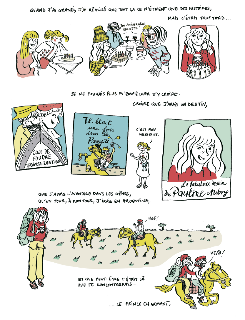 Son arrière-grand-mère européenne espagnole aurait eu le coup de foudre pour son mari français sur un bateau en partance pour l’Amérique du sud, alors l’auteure décide de faire route vers ce qu’elle appelle la Pampa, pour y trouver elle aussi le prince charmant et/ou reconquérir Paul qu’elle espère retrouver à Paris dès son retour.