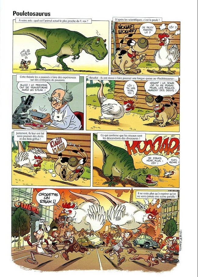 A côté de cela, l’humour vient du fait que les dinosaures humanisés parlent et s’expriment comme nous. Ils deviennent ainsi tout d’un coup plus proches et peuvent être victimes des mêmes petits travers que nous. Mais à l’image de la page de garde, qui présente certains dinosaures dans leur rapport de taille - et pas les mêmes au début et à la fin - on apprend plus qu’on ne rit. Si certains gags, comme « Le Sprinteur » ont un postulat de base hilarant et une chute inattendue, d’autres restent beaucoup plus prévisibles, comme « Majungasaurus » ou « Les dinosaures savent-ils nager ? ». Certains mettent plus en avant la découverte que l’humour comme « La chaîne alimentaire » et ont des chutes un peu plates ou assez inattendues et donc drôles comme « Le plus gros des animaux ». Mais à nos yeux, dans l’ensemble de tous ces gags, il y a trop peu de belles trouvailles humoristiques.