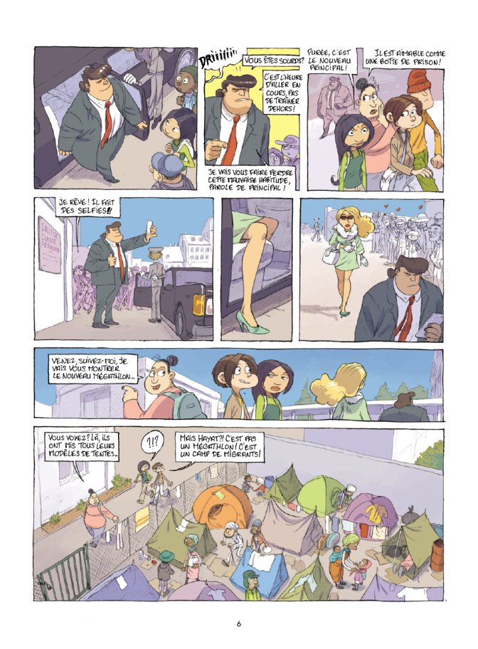 L’histoire démarre par un guide aidant des sans-papiers à atteindre la côte pour l’Angleterre, dans les montagnes enneigées. Enfin, un guide tellement maladroit qu’il essaye de les aider avant d’avoir un accident avec... Le principal du collège ! Le ton est posé. L’humour pour parler de faits de société. Et Téhem ne se contente pas de faire une bande dessinée humoristique, il pousse le curseur avec des personnages archétypaux, caricaturaux même mais tirant le rire presque vers l’absurde. On ne peut vous dévoiler les drôles de situations qui se produisent autour de Jean-Eudes et Ecoline, mais les surprises sont au rendez-vous.