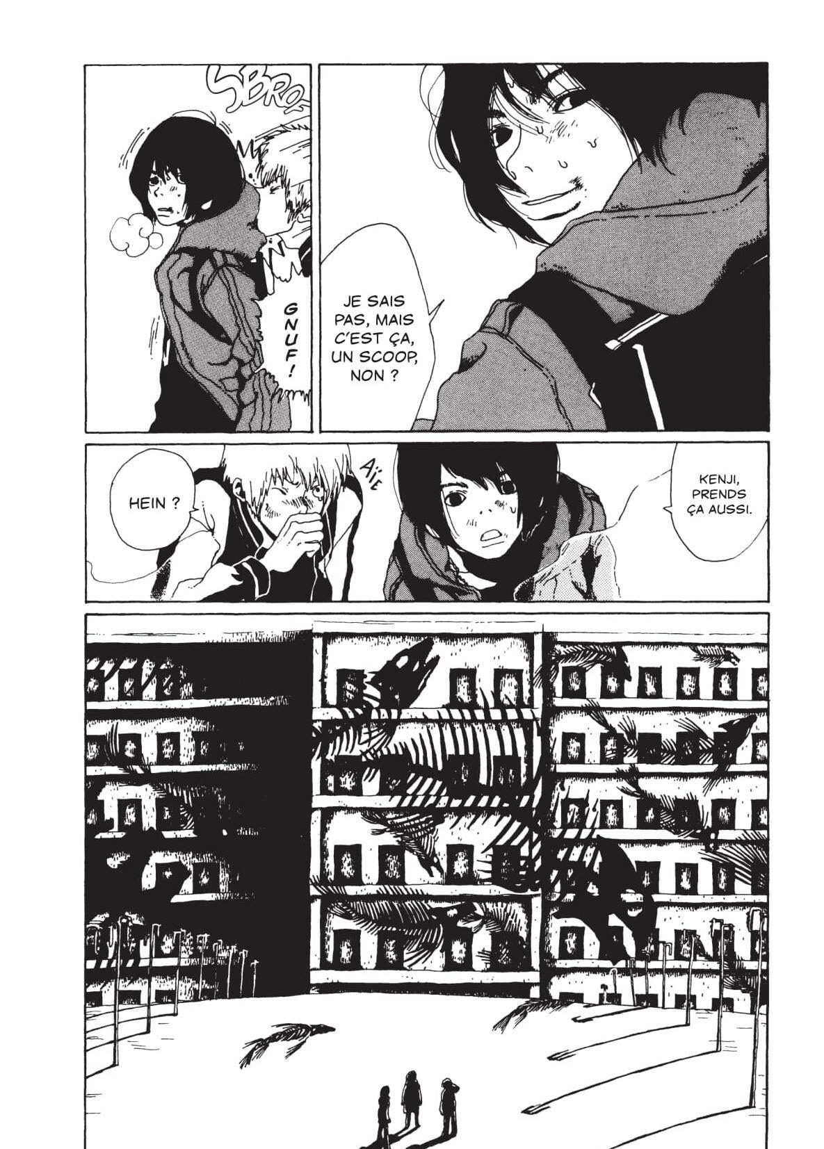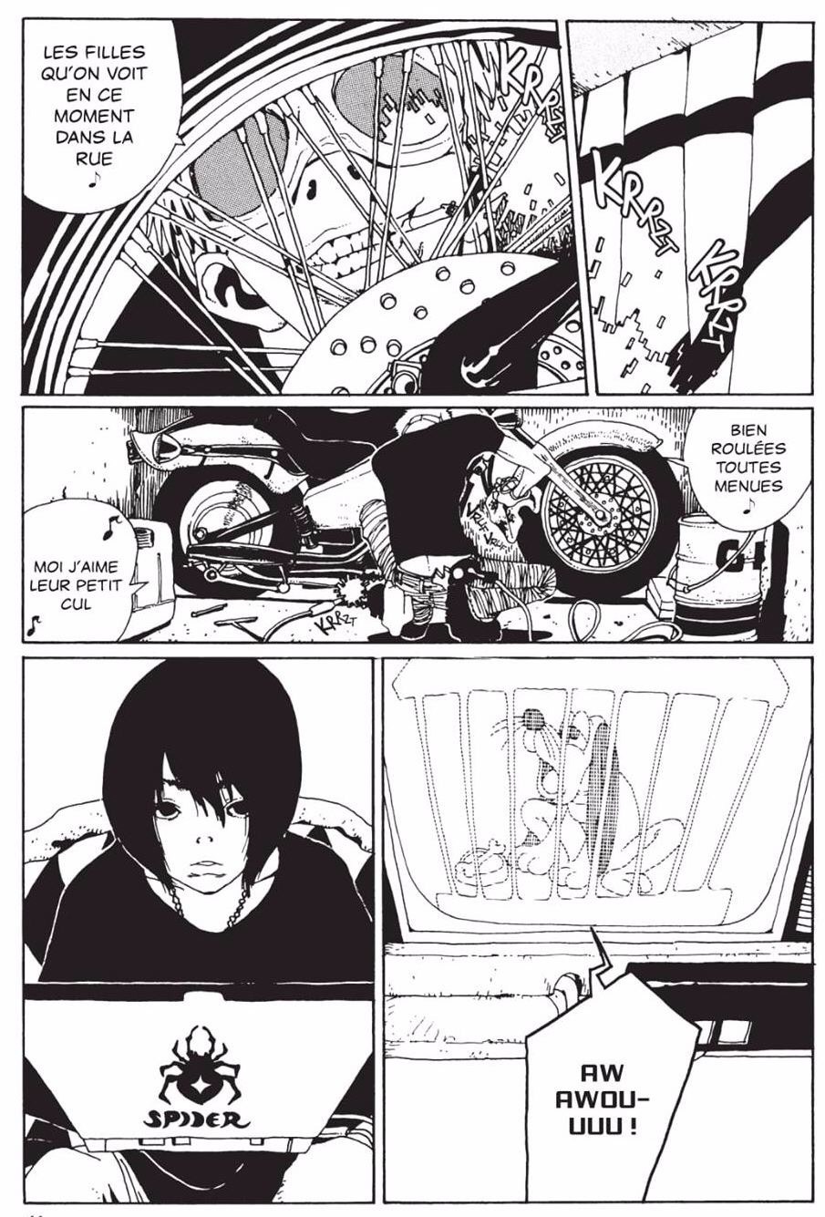 Le futur n’est pas très encourageant. Les villes sont aseptisées ou en ruines, les jeunes livrés à eux-mêmes ou en centres de détention, des rebelles déjantés et des fascistes torturés, tout y est en opposition. Au milieu, plusieurs adolescents tentent de survivre : ce sont les enfants de l’araignée, qui tisse une toile macabre tout autour d’eux, en quête de vie et de vérité. Entre complot gouvernemental et bande de jeunes violents et pommés, forcément la comparaison avec le monument Akira ne tarde pas à s’immiscer chez le lecteur. Sans avoir la puissance, liée à l’absence de motos notamment, de son prédécesseur, l’œuvre de Mario Tamura a cependant d’autres atouts. Le premier, c’est le malaise qu’il provoque, car son caractère malsain latent est impressionnant. Les jeunes filles sont par exemple quelques fois dénudées, mais toujours dans une position de faiblesse, de fragilité, même si les personnages féminins ont un caractère fort. Elles éclipsent d’ailleurs le duo de héros qui débute l’histoire, râleurs invétérés, courageux devant les pistolets et timides devant les décolletés. Le second, c’est que petit à petit, des ramifications s’installent, avec des personnages fugaces qui débarquent, souvent venant du mauvais côté, qui contribuent à instaurer un climat d’angoisse. La fin est en cela surprenante, arrivée trop vite, sans prévenir et sans indice. Elle met à mal l’ensemble, qui s’était construit patiemment. Fait rare pour un manga, il aurait mérité d’être plus long.