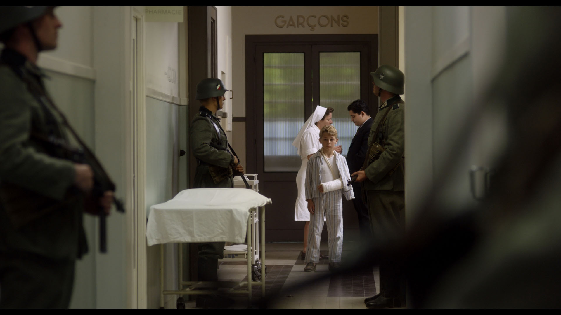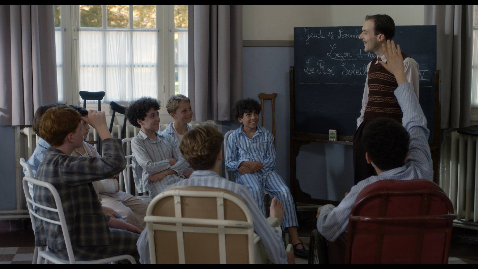 Les plans serrés sur les visages nous renseignent avec précision sur l’état d’esprit de nos héros et créent une proximité immédiate. Si tous ces jeunes acteurs brillent par l’authenticité de leur interprétation, Maurice (Matteo Perez) au jeu intense et au physique avenant captive le regard tandis que son voisin de lit, Samuel (Néo Rouleau), sorte de« Petit Gibus » à la frimousse irrésistible et aux réparties confondantes de naturel, fait fondre les cœurs. Les dialogues pleins de vivacité donnent lieu à des échanges percutants. Même lors des moments les plus cruciaux (comme la visite des nazis au sein de l’hôpital), leur rythme ne faiblit pas. C’est dans la joie et la bonne humeur que cette joyeuse bande mange des carottes en rêvant de gâteaux et c’est en inventant une chanson qu’elle détourne la leçon de grammaire que tente de lui inculquer l’instituteur (Antoine Gouy), un jeune homme sympathique et à l’écoute des enfants, qui fait le lien entre ce huis clos parfois étouffant et les événements extérieurs. Il est l’intermédiaire qui fait entrer la « grande Histoire » dans la « petite histoire » de Maurice et ses copains. Mais c’est à travers de M. Clément (François Patissier), l’homme de ménage, que l’humour s’installe vraiment. Ce personnage sourd et un peu simplet, légèrement alcoolique mais totalement dévoué insuffle, bien malgré lui, un esprit burlesque à la Charlie Chaplin.