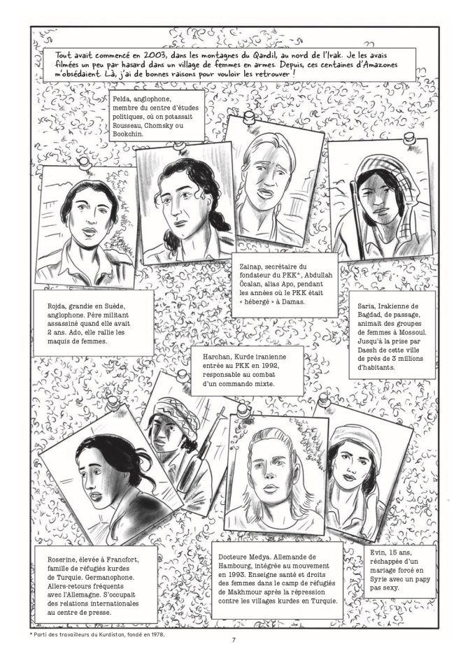 De la Tchétchénie à l’Irak en passant par la Colombie, la documentariste Mylène Sauloy a couvert de nombreux terrains de conflits. Son travail l’a conduit à la rencontre en 2003 de ces femmes kurdes en armes dans les montagnes du Qandil, au nord de l’Irak. Elle est par la suite régulièrement retournée voir ces « Amazones », comme l’autrice les appelle. De ces rencontre est tiré La guerre des filles, un documentaire réalisé pour Arte qui a reçu plusieurs prix. Les filles du Kurdistan se situe dans la continuité de ce film documentaire. Elle retrace son périple pour se rendre au Kurdistan irakien et syrien et son combat pour attirer l’attention des médias occidentaux sur ces femmes si éloignées des clichés européens sur le Proche et le Moyen-Orient. Mais loin de se mettre en scène de façon narcissique, elle donne la parole à ces femmes dont elle admire et partage le combat. La bande dessinée s’attarde sur les convictions idéologiques de ces combattantes et leur rôle dans le combat indépendantiste kurde, alors que le Parti des travailleurs du Kurdistan (PKK) est classé parmi les organisations terroristes par la plupart des chancelleries occidentales en raison de la lutte que mène cette organisation contre la Turquie, membre de l’OTAN.