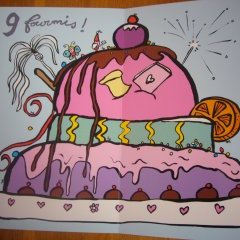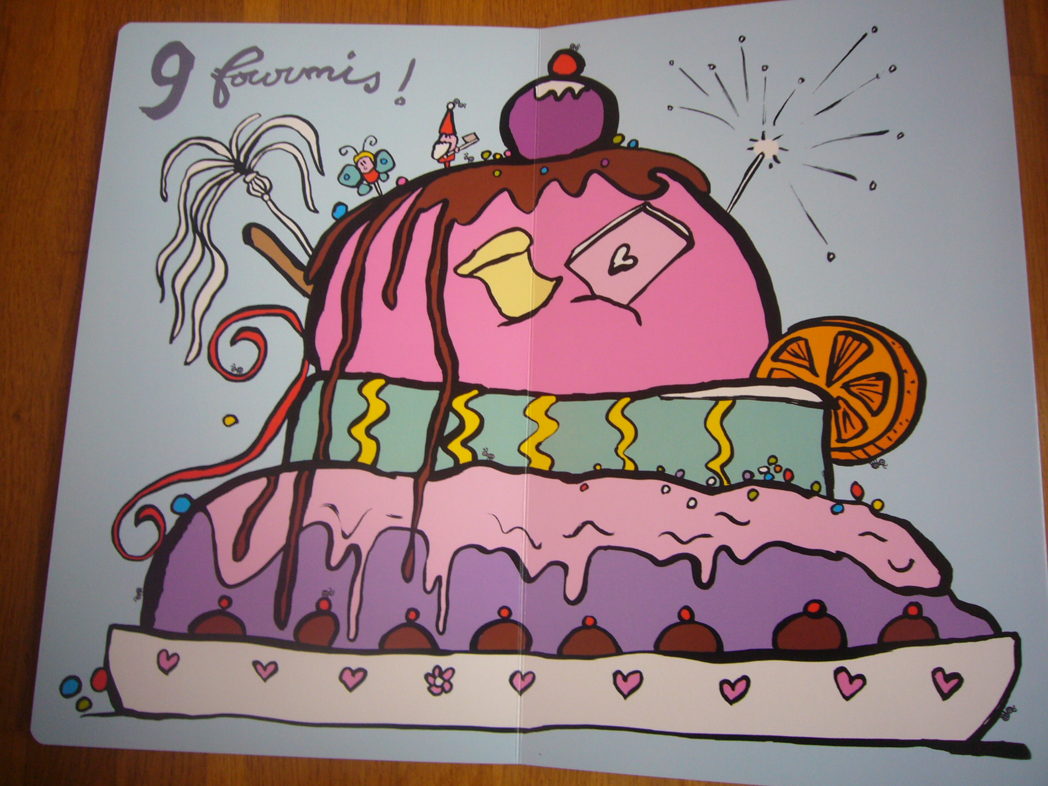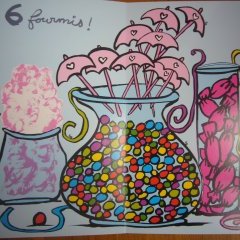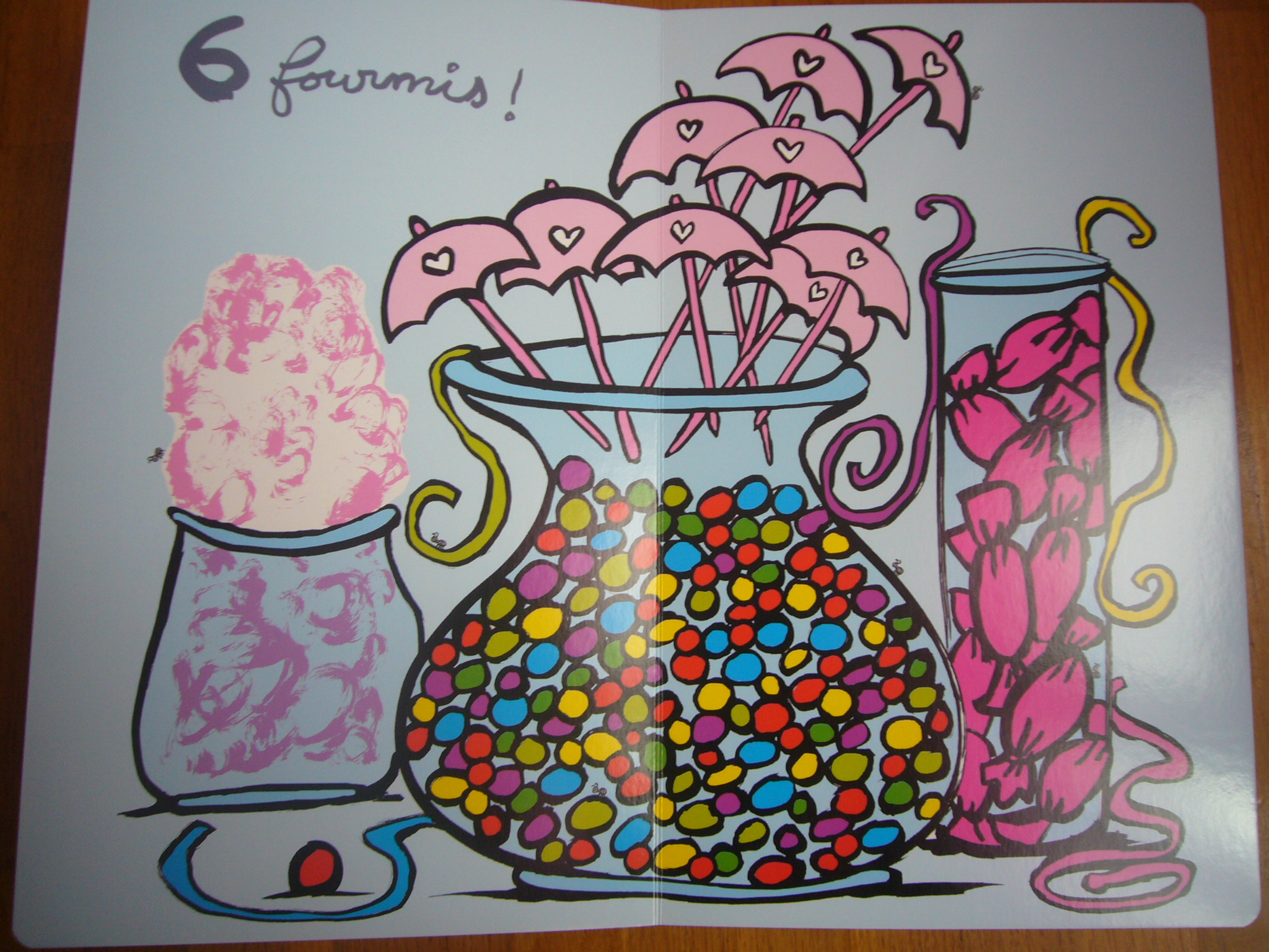 Nous sommes ici en situation de pique nique, un anniversaire, plongés dans des couleurs acidulées aux parfums de fraise, chocolat et ... euh Stroumpf, peut-être, pour la glace bleue ?