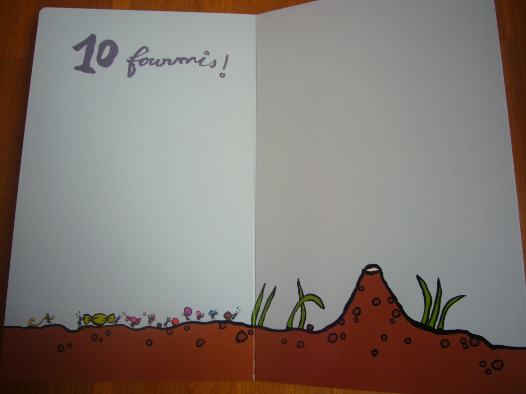Mais de petites bestioles, 1, 2, 3 puis 10 ! ... se sont invitées dans les immenses pages de ce beau livre “les fourmis” .