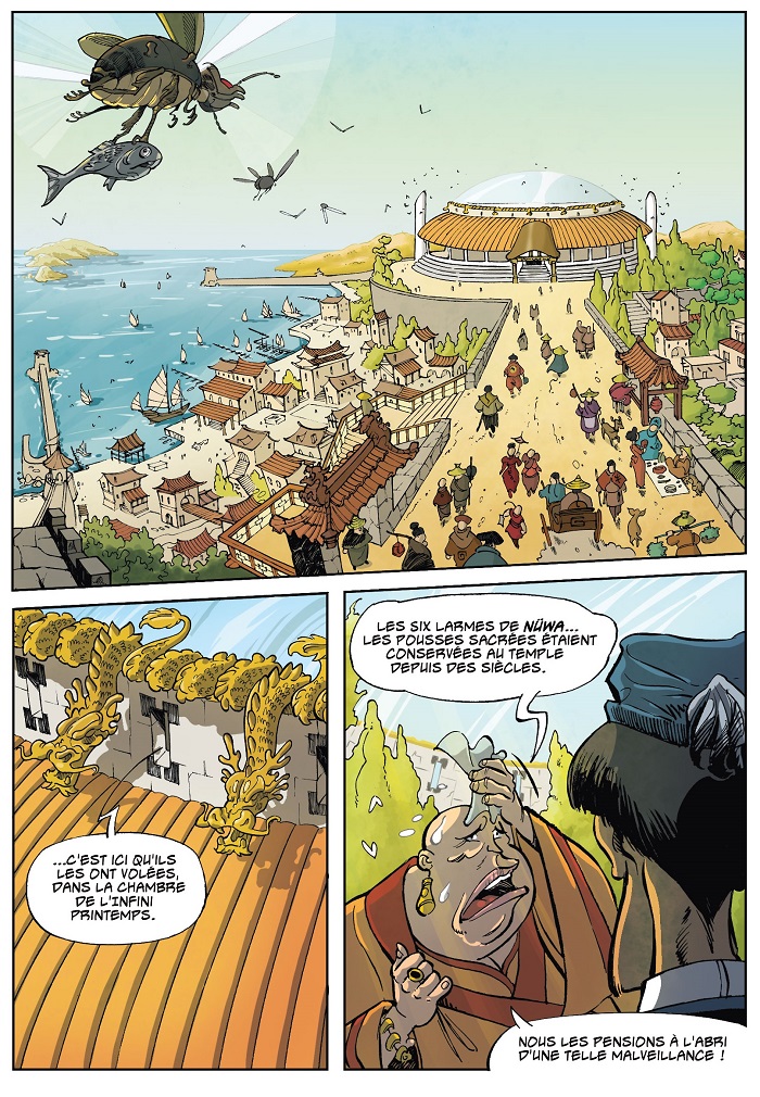 Le graphisme est très réussi et ne nuit pas du tout à la lecture hachée - puisqu’on saute de groupes de cases en groupes de cases - de l’histoire. Ben Jurdic a opté pour un style qui rend cette aventure vivante et même vraisemblable. Les personnages sont assez stylisés, sans trop pousser et garde ainsi une part réaliste. Les visages expressifs et les attitudes des corps donnent vie à ce petit monde. On s’immerge sans problème dans cet univers graphique et narratif. Pas besoin de haute culture sur l’histoire de Chine pour prendre plaisir à fouiller la ville à la recherche des larmes de Nuwä.