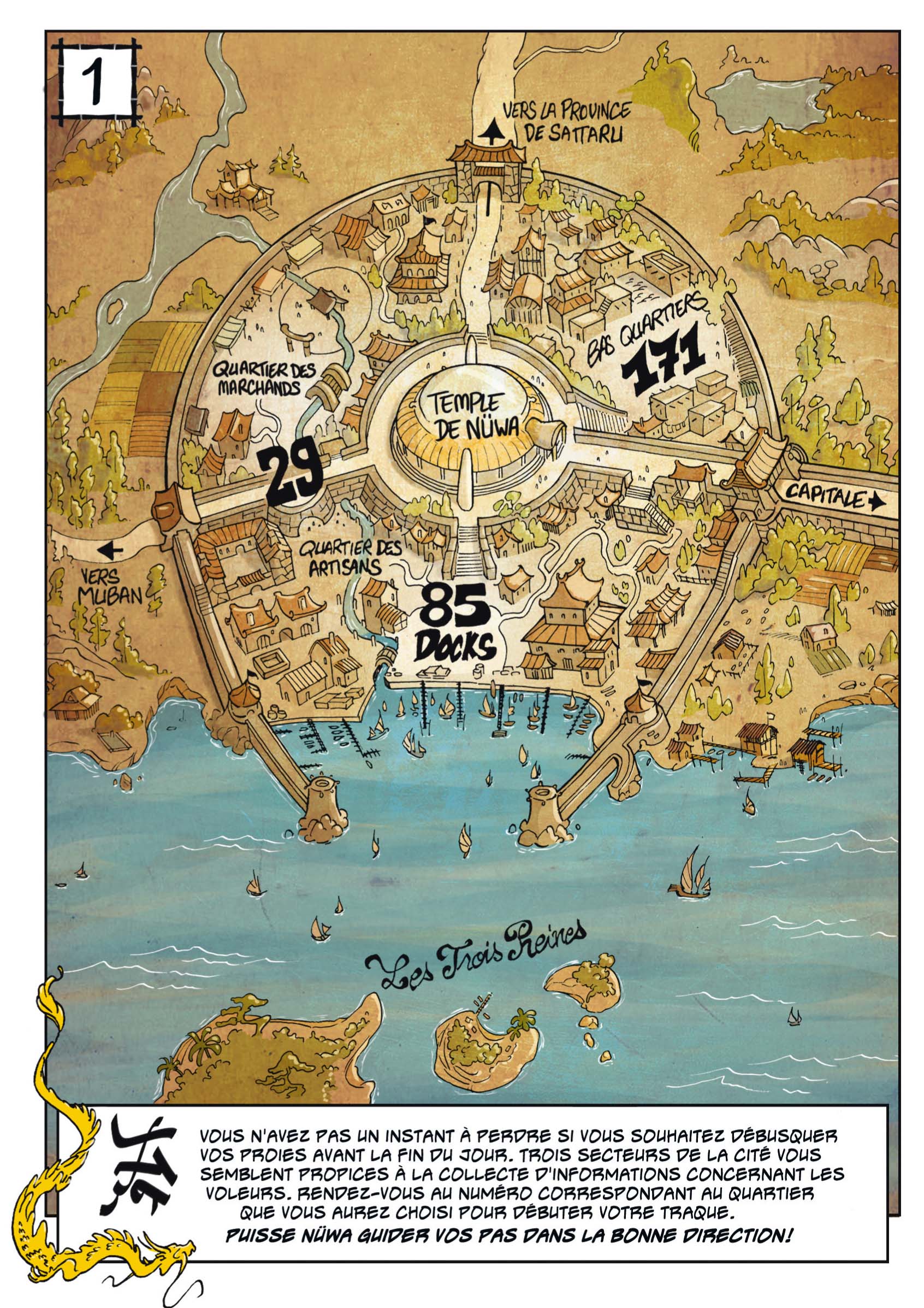 Chine médiévale, patrie des légendes et des créatures étranges. Hors, les larmes de Nuwä, reliques anciennes et sacrées, ont été volées au temple. Et devinez quoi ? Vous jouerez la chasseuse de primes chargée de les retrouver. Bien sûr, il y a plusieurs voleurs et le temps joue, lui, contre vous. Alors ne perdez pas un instant et plongez dans cette aventure au gré des pages de cette BD pas comme les autres.