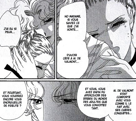 La rivalité des exploits amoureux entre la marquise de Merteuil et le vicomte de Valmont n’est plus à présenter. Incontournable de la littérature française, la correspondance de ces deux personnages libertins est devenue un classique, écrit par Laclos. Ses adaptations ont été nombreuses, notamment sur grand écran. Le manga se devait d’y apporter son écot, avec un shôjo très fin, discret et tout en non-dit, reprenant ainsi parfaitement les codes du roman. De nombreuses lettres y sont d’ailleurs retranscrites, tant l’épistolaire joue ici son rôle. Les avancées y sont racontées à la première personne, et les deux personnages se livrent entièrement. Cette édition intégrale regroupe les deux volumes, qui enserrent toute l’histoire. L’auteur ayant décidé de situer son action à l’aube de la Révolution française, quelques références y font allusion, les décors et les costumes se chargeant de l’illusion. Les personnages sont magnifiques, élancés, séducteurs ou candides, les yeux brillants ou embués de larmes, sans jamais tomber dans les mines comiques et simplifiées communes à certains mangas. Celui-ci reste sérieux du début à la fin, comme si la frivolité des discussions ne pouvait empêcher l’autorité de l’histoire et de la psychologie. Si les bonds dans le temps sont parfois fluctuants et peuvent faire perdre quelque peu pied par moment, le découpage en chapitres artificiels se fait sans heurts, et même avec grâce.