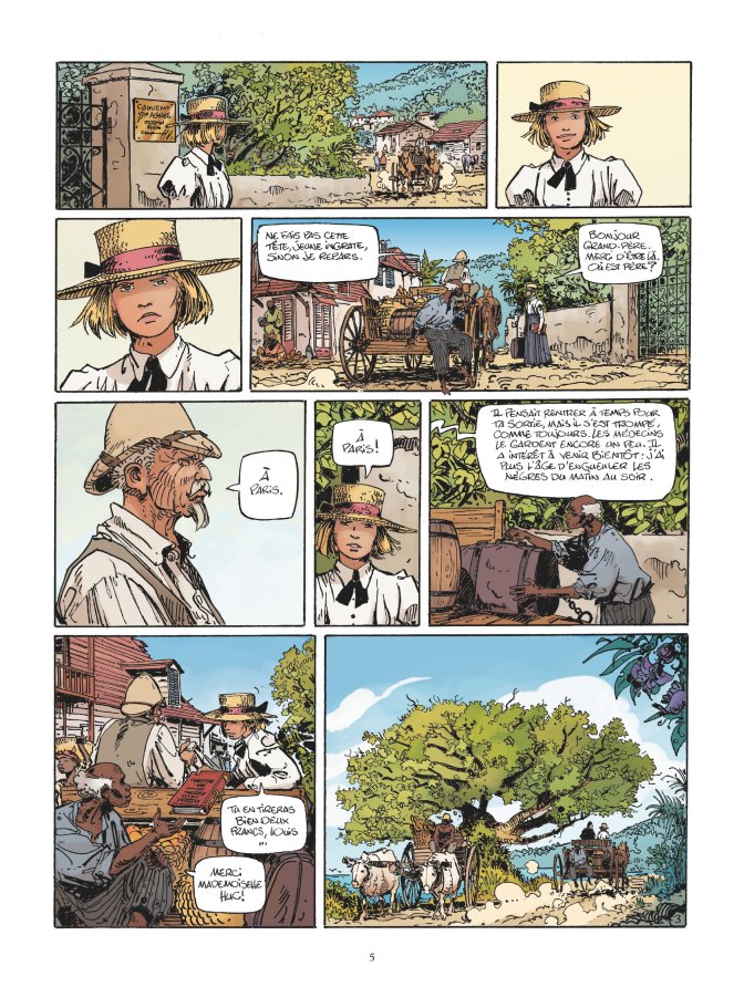 C’est une part de l’histoire de France qu’interrogent le scénariste Stéphane Piatzszek et le dessinateur Gilles Mezzomo. Le choix de montrer l’agonie du système de plantations à la veille de l’abolition de l’esclavage par la Deuxième république s’avère pertinent. L’esclavage – et le racisme qui légitime cette pratique – est montré sans détour dans toute sa violence, une réalité tragique qu’il ne fallait pas édulcorer. Le personnage de Volny, ancien esclave devenu planteur à son tour, est à cet égard très intéressant puisque son existence même interroge la hiérarchie raciale inhérente au système de la plantation. La jeune Eliza, bien qu’elle agisse régulièrement de manière inconséquente, suscite l’empathie du lecteur pour sa révolte contre ce système, mais aussi parce qu’elle a de la suite dans les idées…
