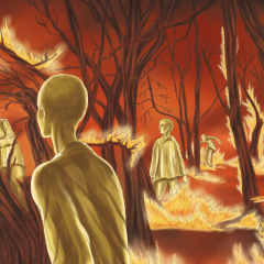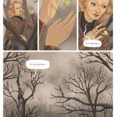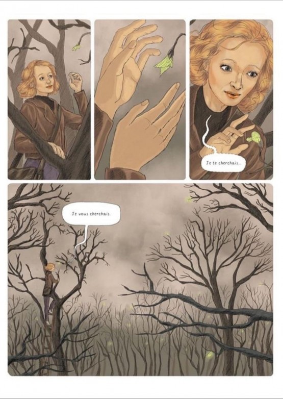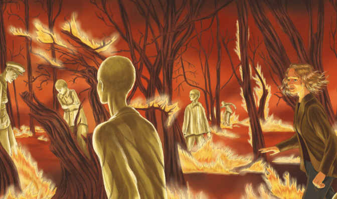 Si Théa Rojzman a du s’ingénier à placer les morceaux de l’article, tout en conservant la trame du reportage et les hésitations de l’autrice originale, Tamia Baudouin a du elle s’employer à retranscrire une atmosphère mêlant l’horreur vécue par les témoins, les conséquences psychologiques de cette horreur au quotidien des années 90, les traumatismes qu’elle a engendré dans le subconscient des générations suivantes, sans oublier le ressenti d’Annick Cojean face à tant de drames. Ainsi, le dessin qu’elle livre ni violent, ni réaliste, mais d’une horreur artistique, celle d’un Munch et de son cri, avec des formes éthérées, sans être des prisonniers étiques, presque des spectres venus hanter ceux qui restent, ceux qui viennent après eux, dans des paysages qui ne veulent pas ressembler à Auschwitz de 1945 ou à une Allemagne de 1996, prenant le parti de balayer avec le dessin toutes ces émotions et ces trop-pleins plutôt que de rendre compte de lieux et de chiffres, à l’image finalement de ce qu’avait cherché à faire Cojean quand elle écrivait son reportage : livrer une vision imparfaite mais vive, une lumière sur les fumées et les cendres de ce qui avait été le pire de l’humanité.