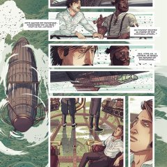 La noirceur a déjà été évoquée, et il faut dire que peu d’êtres vont échapper à cette métamorphose qui semble gagner jusqu’aux pages. L’ambiance proche du steampunk se décompose pour une technologie proche du vivant, mélange de la machine et de la biologie qui ici rappelle les arco-flagellants de l’univers Inquisitor. C’est dans une ambiance confinant presque à l’horreur que le dessin semble lentement glisser, avec des visages, et même des pages entières, de cadavres reprenant corps et littéralement goût à la vie.