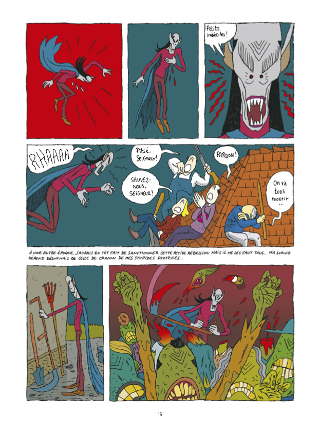 Si Les Moribonds est éminemment politique, c’est également un récit très drôle, marqué par un comique de caractère – des états d’âme du vampire à la bêtise de certains hommes en passant par la vieille dame sage qui fait office de psychologue à Gabriel – et de situation. Florence Dupré La Tour s’en donne à cœur joie et invente des situations cocasses : ingurgité par les êtres humain, le sang de vampire stimule la sexualité et conduit à des orgies (le troupeau peut donc se reproduire). On retient également le caractère jouissif de l’inversion des rôles, lorsque le puissant Gabriel est réduit à faire les travaux des champs à la place de son troupeau tire-au-flanc qui comprend que le « seigneur » est en réalisé dépendant d’eux…