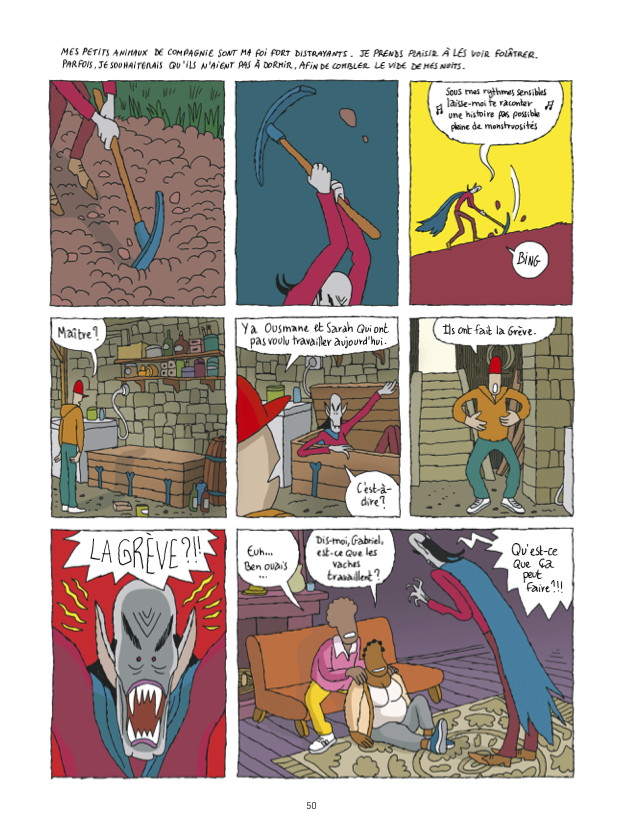 Critique : Bien connue pour ses bandes dessinées autobiographiques (Cruelle, Pucelle, Jumelle sans compter Jeune et fauchée qui sort en même temps que Les Moribonds), Florence Dupré La Tour fait un détour par le genre post-apocalyptique pour parler de sujets bien ancrés dans notre contemporain : les rapports sociaux de domination et le travail, dans un monde qui va mal. La métaphore fonctionne particulièrement bien. Le vampire est une allégorie du noble ou du grand patron qui suce le sang des employés placés sous sa dépendance. Dans le récit, les êtres humains auraient bien du mal à survivre sans l’intervention du vampire, capable de tuer aisément les Moribonds et d’apporter de la nourriture au petit groupe. Toutefois, et comme le sait bien tout communiste, la force du patron-vampire ne tient qu’à la force de travail (ici, la force vitale) des personnes placées sous sa domination. Sans son troupeau, Gabriel sait qu’il est démuni, car la région ne recèle plus vraiment de survivants humains : il est donc contraint de protéger son « troupeau », même lorsque celui-ci lui désobéit, ou tente d’instaurer un rapport de force…