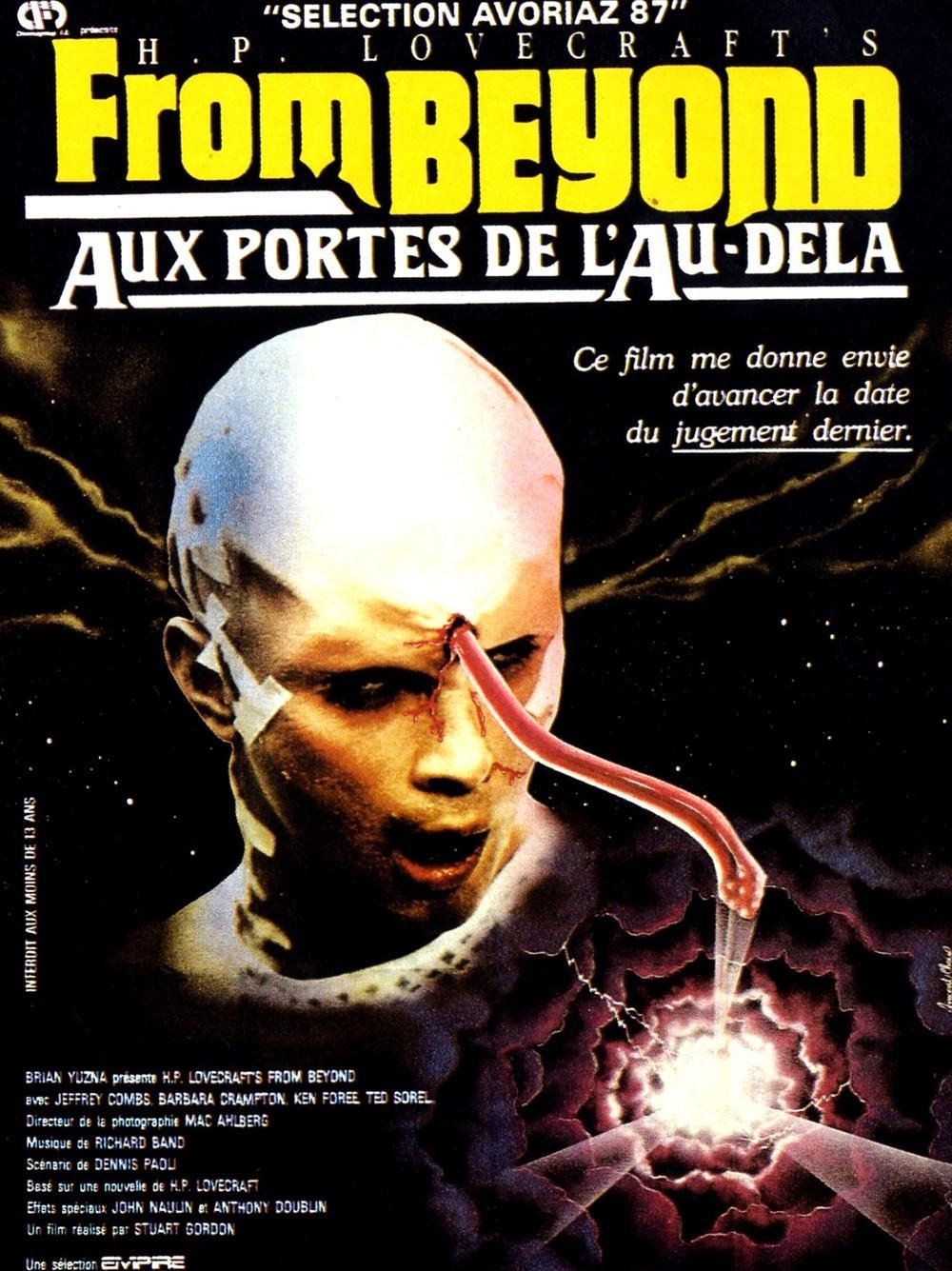 Deux chercheurs en paranormal, le Dr Pretorius et son assistant Crawford Tillinghast, mettent au point un appareil censé stimuler la glande pinéale (ou épiphyse) dans le but de permettre à l’être humain de percevoir l’existence d’autres réalités dimensionnelles imbriquées dans la nôtre. Bien évidemment, la première expérience tourne au fiasco et le docteur Pretorius y laisse la vie… Enfin pas tout à fait… Après avoir remporté le jackpot avec leur excellent Reanimator en 1985, Stuart Gordon et son équipe décident d’explorer encore un peu l’œuvre de H.P Lovecraft à travers ce From Beyond (aux portes de l’au-delà) particulièrement généreux en monstres gélatineux affamés de cerveaux humains et en psychiatre sexy en tenue SM… Métaphores sexuelles à tous les étages (pas toujours très subtiles), des éclairages roses à en dégoûter Hello Kitty, une interprétation solide (le couple Crampton/Combs fonctionne à merveille) et un docteur Pretorius polymorphe qui garantie une belle nuit agitée… Un vrai classique d’ Halloween ! (Texte de Romain Néophyte)