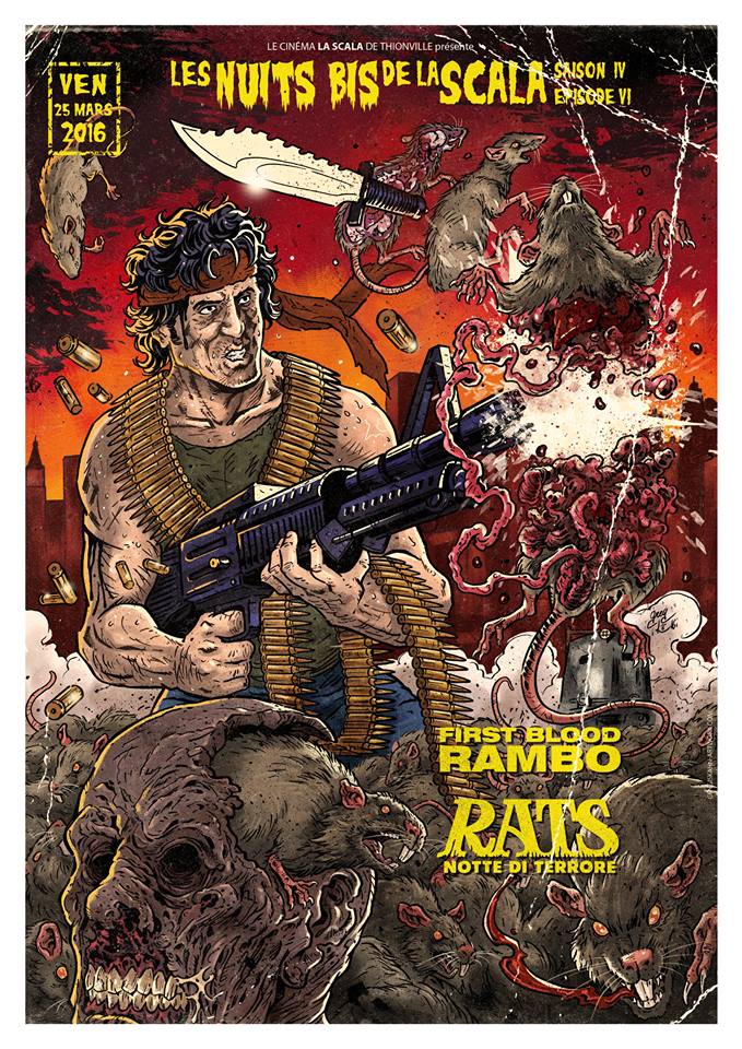 En mars, les nuits bis de la Scala bandent les muscles mon colonel ! Calibres fumants, lames affutées et vermines des bas fonds vous donnent rendez-vous le vendredi 25 mars 2016 dès 20h30. À noter que Quenottes, vainqueur du Prix du meilleur court métrage au dernier festival de Gérardmer sera présenté en avant séance.