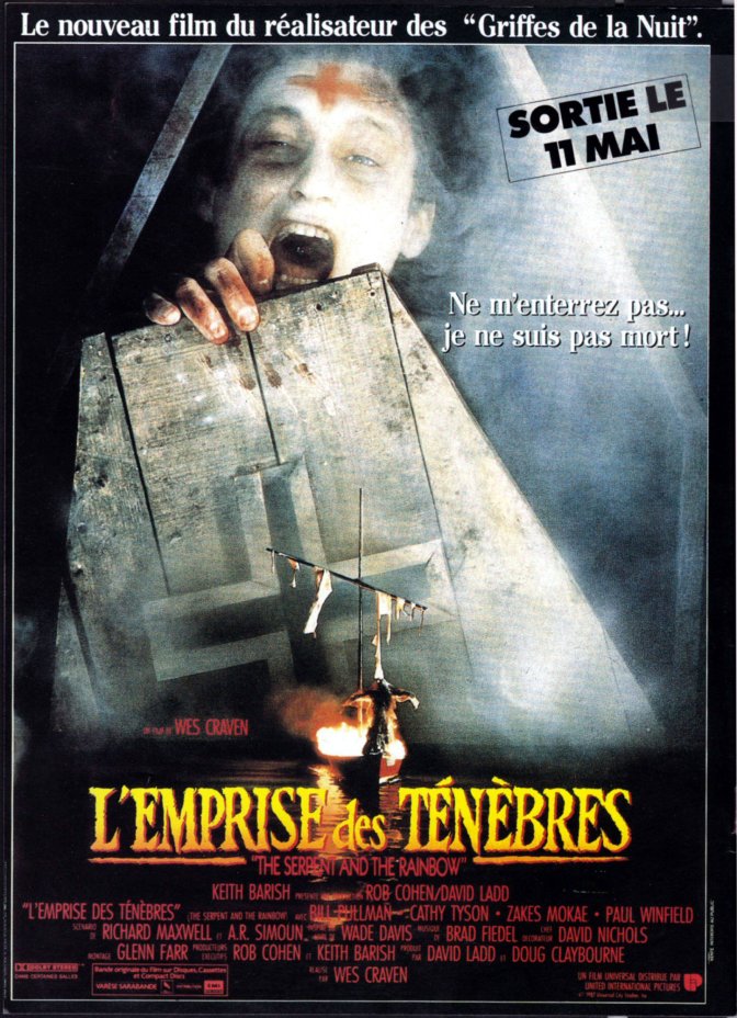 Dennis Alan, un jeune anthropologue, est envoyé en mission dans une clinique à Haïti pour rencontrer un étrange patient diagnostiqué mort et enterré quelques années plus tôt. Arrivé sur l’île, Alan apprend l’existence d’une mystérieuse poudre vaudou capable de plonger un homme dans une mort artificielle. Son enquête le met bientôt aux prises avec les Tontons Macoutes, des miliciens paramilitaires qui utilisent cette drogue pour éliminer les opposants politiques au régime. Menacé de mort, Alan tente de récupérer la recette du poison avant de repartir pour Boston. Mais, ensorcelé par ses ennemis, il ne tarde pas à sombrer dans un univers de magie noire, où se mêlent hallucinations, cauchemars et réalité. Ayant acquis une certaine légitimité aux yeux des grands studios, Wes Craven se voit attribuer une enveloppe assez confortable pour adapter le roman The Serpent and the Rainbow de Wade Davis au cinéma. Une occasion unique pour le réalisateur de la Dernière maison sur la gauche de mettre en scène une des figures importantes du bestiaire fantastique : le zombie. Un mort-vivant à la sauce créole plus proche des origines du mythe que les cadavres ambulants du père Romero ! Macabre, onirique et particulièrement angoissant, The Serpent and the Rainbow est aussi un grand film politique… Assurément l’un des meilleurs long-métrage de son auteur (après le téléfilm L’été de la peur).