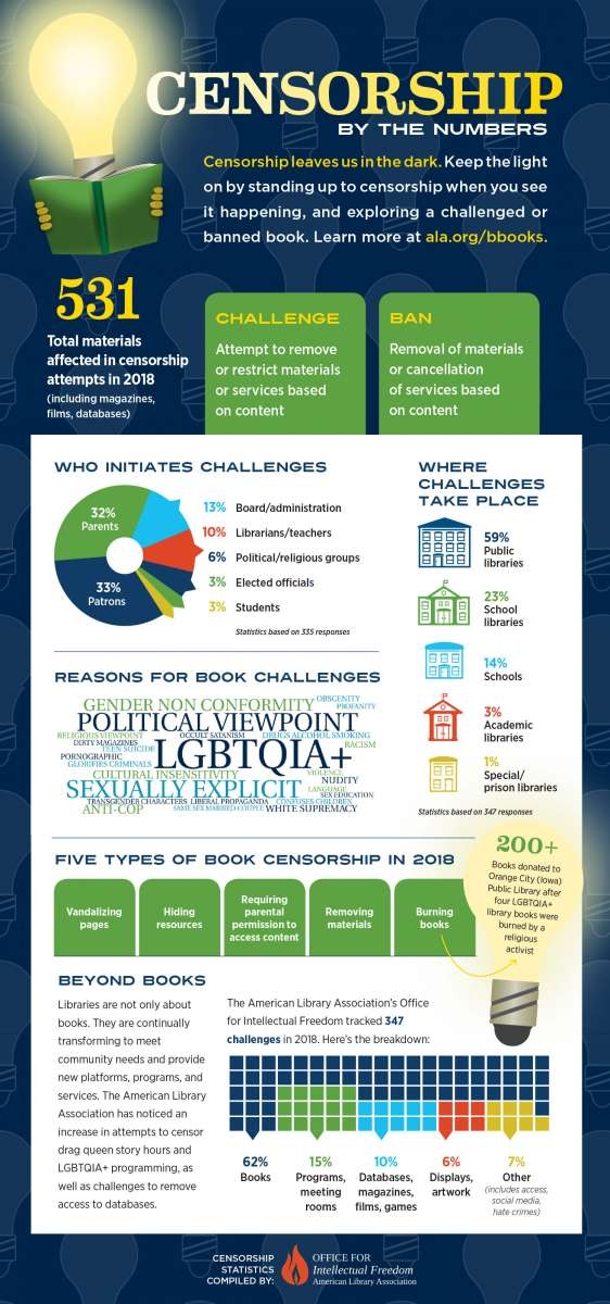 News : Dans le cadre de la semaine nationale des bibliothécaires, l’American Library Association, chargée de la liberté d’expression, a dévoilé son rapport annuel qui mentionne la liste des livres les plus censurés aux États-Unis en 2018, parmi une liste de 483 ouvrages qui ont subi une interdiction. Pas forcément de l’administration américaine, d’ailleurs (seulement 13%), en fait surtout des parents de jeunes lecteurs (plus d’un tiers), alors que les patrons qui ont réprouvé les ouvrages en question représentent 31%.