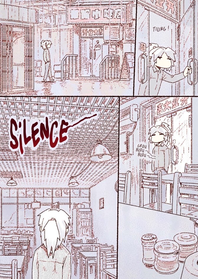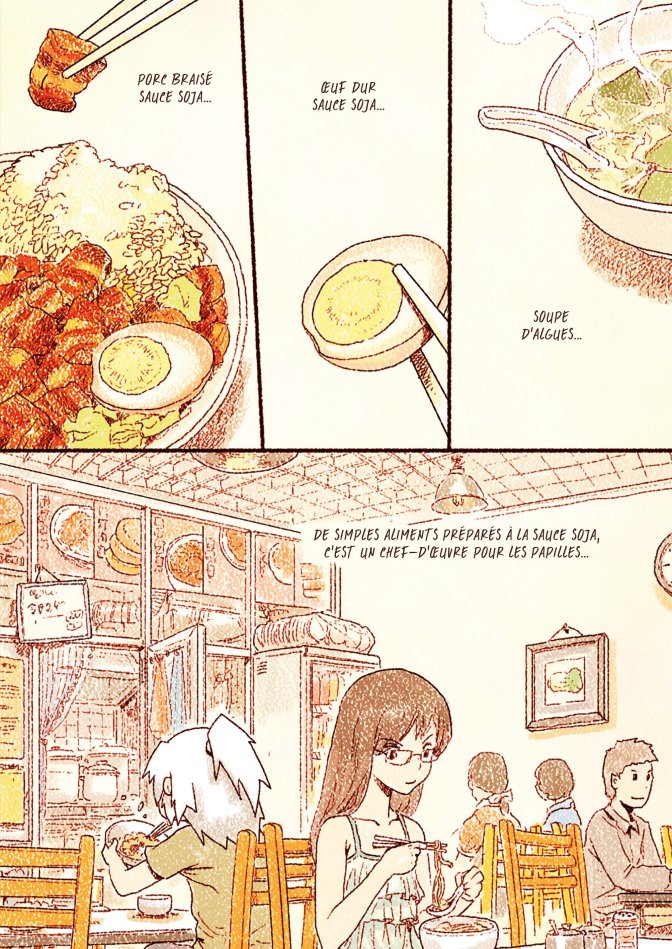 Yao Ren parle d’un petit restaurant de quartier, de l’hiver dans un parc, des caches de chat créées par l’homme, des histoires que lui contait sa mère quand il était enfant ou de la pluie battant les rues de Shanghai. Ces sujets d’une banalité sidérante au premiers abord, finissent par nous emporter. D’abord car, comme le recueil le signale d’entrée, il s’agit plus de contemplations, de découverte de paysages, de la vie autour de soi que de récits à la dramaturgie structurée. Des contemplations autant narratives que graphiques. Mais peut-être surtout car il y a la découverte, pour ceux qui ne connaissent pas la Chine, de cet immense pays par le petit bout de la lorgnette. Vous ne verrez pas les quartiers résidentiels et commerciaux de Shanghai mais bien les petites rues désertes, les jardins vides, le troquet du coin, le parc... Et tous ces petits endroits révélés par le dessin qui met en scène un temps capable de se suspendre sur quelques cases avant de reprendre son cours vous donneront envie de découvrir cette Shanghai là.
