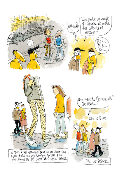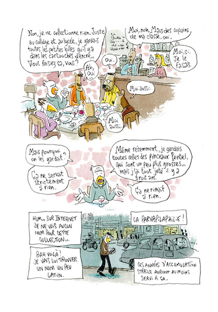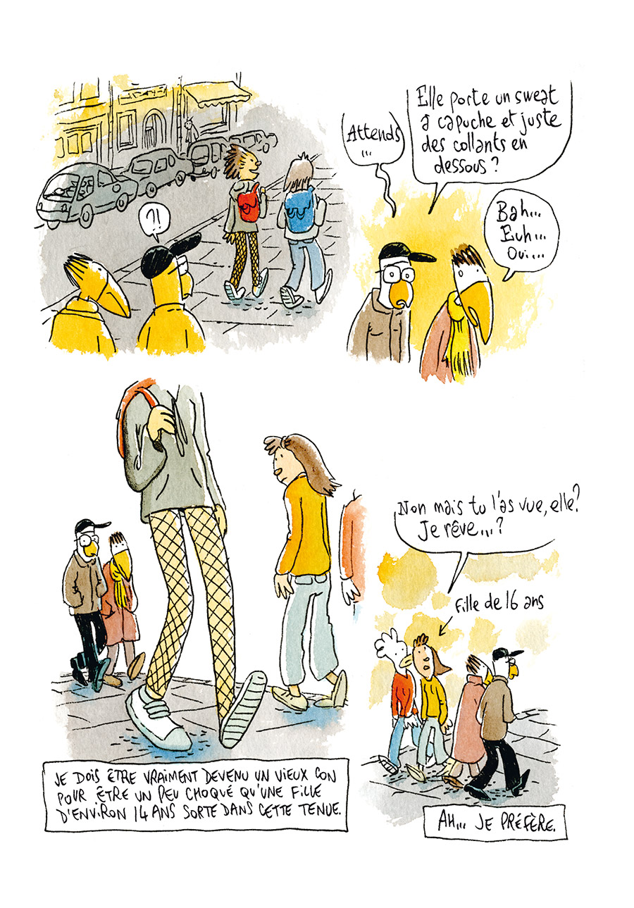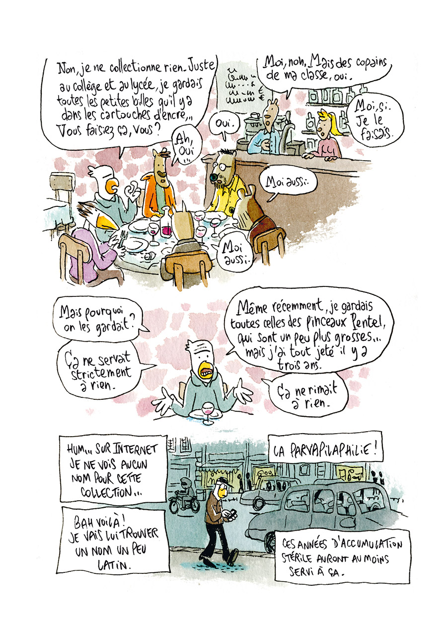 Côté dessin, la patte de l’artiste se reconnaît comme toujours au premier abord : les formes animales préservent l’anonymat, et très vite on oublie la forme de l’oiseau, avatar de l’auteur. L’apparence de simplicité du dessin ne doit pas masquer des pages détaillées, avec des décors très réalistes, des allures qui sentent le vécu, qui contribuent à créer une richesse dans l’univers de Trondheim. Chaque tome enrichit en effet davantage ce monde que l’auteur découpe, donne à voir et peint, avec son style, de vérité, qui peut mêler sur une même planche le bitume et la plage, les deux étant rendus avec le même soin. C’est cette pertinence pour rendre une rue, un intérieur, et au final le monde entier avec cette possibilité de la beauté en arrière plan et le détritus dans le coin, qui fait en vérité la force des Petits Riens.