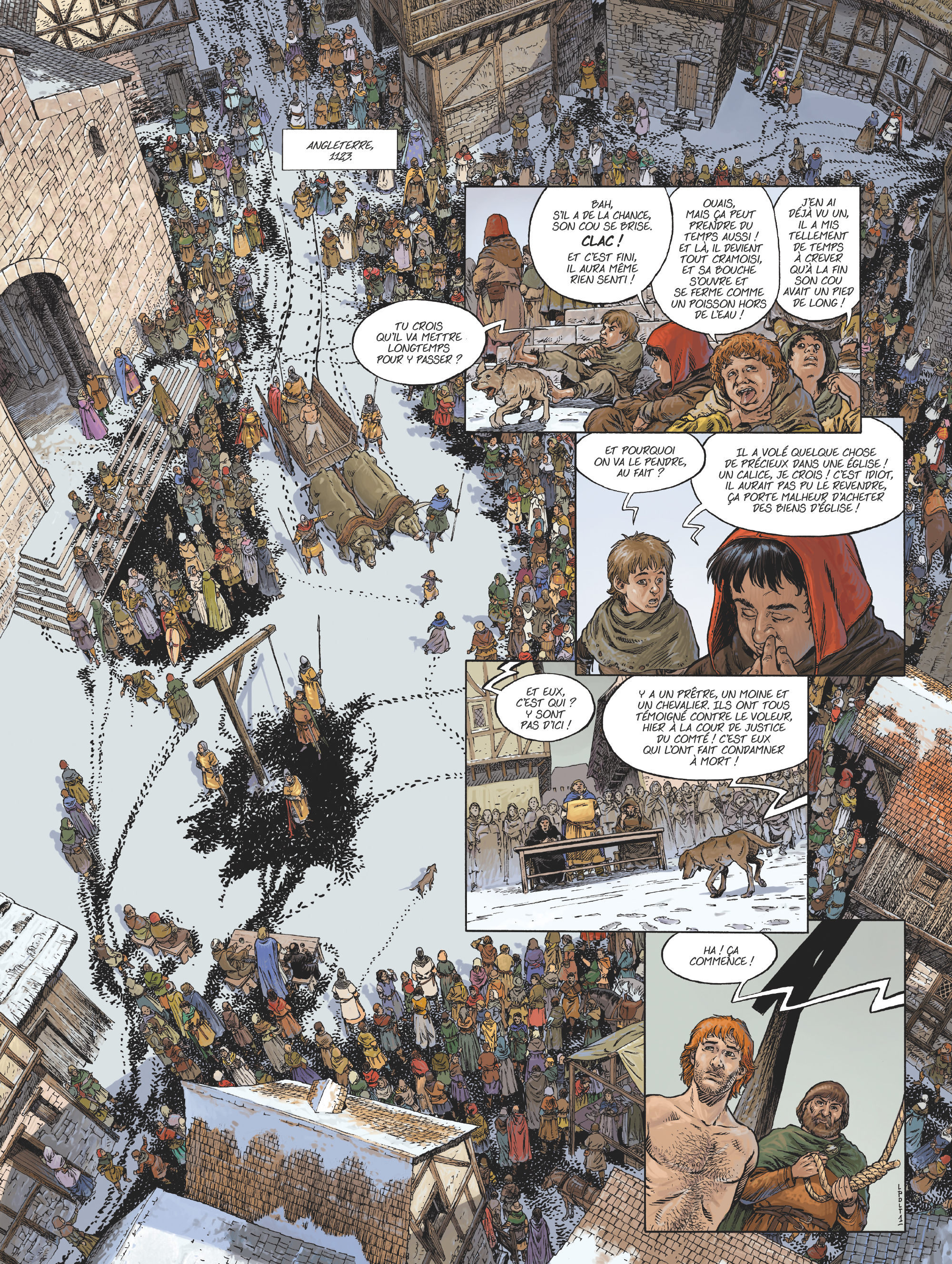 Critique :Succès d’édition colossal qui a déjà connu une adaptation à l’écran et en jeu vidéo, la fresque de Ken Follett figure désormais en bande dessinée. Ce projet est porté par l’expérimenté scénariste Didier Alcante (Rani, La Bombe) qui explique sa démarche dans une éclairante postface dans laquelle il souligne son amour du roman – qu’il lisait à voix haute à son épouse – et son désir d’en faire une adaptation fidèle, malgré l’obligation de « réaménager, déplacer, voire supprimer, certaines séquences ». À la lecture de ce premier tome d’une série qui doit en comporter 6, le pari d’Alcante est réussi.