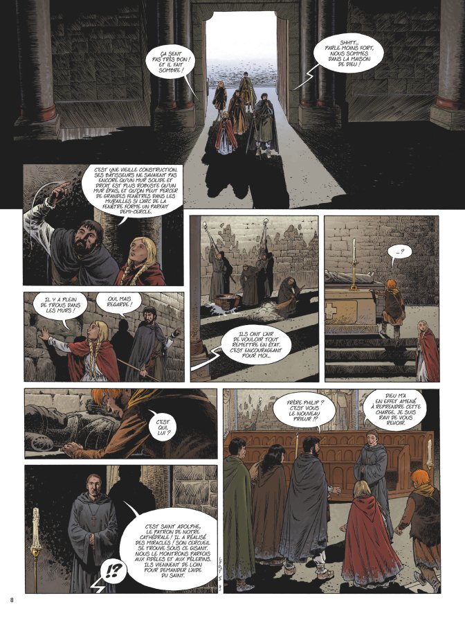 Critique : Le deuxième volume de cette adaptation, qui en comptera six, confirme les qualités du premier tome – une narration dynamique et fluide qui est fidèle à l’esprit et à la trame du roman qu’il adapte, un dessin particulièrement soigné – et l’impression d’être face à une bande dessinée de grand spectacle, au souffle épique et à l’atmosphère dramatique. Avec ses intrigues, ses rebondissement et son souffle épique, la saga de Ken Follet offre en effet une matière particulièrement riche, dont cette adaptation s’empare très bien. Les auteurs évitent l’écueil des longs blocs de texte et laissent respirer les planches, en offrant une très belle reconstitution au lecteur. La bande dessinée a cette capacité de retranscrire graphiquement une réalité historique à partir de quelques coups de crayons, là où le cinéma devrait dépenser quelques centaines de milliers d’euros en costumes et en décors.