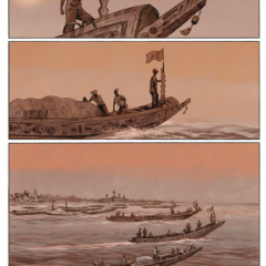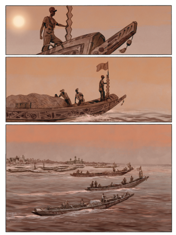 Les planches de Jean-Denis Pendaux, formidable aquarelliste, retranscrivent avec réalisme et chaleur les ambiances du littoral gambien grâce à des jeux de lumières et des nuances de couleurs. Quelques pages muettes s’arrêtent sur le paysage et procurent une respiration au lecteur, qui se délectera de la beauté des images. On sent que Pendaux a réalisé des dessins d’observation sur place : tout, dans cette histoire, transpire le réalisme. Le soin apporté par le dessinateur dans la représentation des pêcheurs et de la côte gambienne servent le récit, puisque c’est ce monde qui est menacé par l’usine.