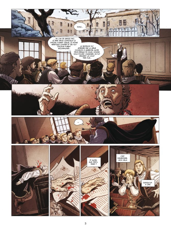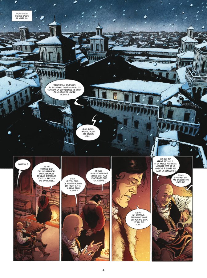 Mêler découverte scientifique réelle et enquête fictive, le tout assaisonné d’expériences d’alchimie plus ou moins précises, pouvait se révéler une recette un peu indigeste pour le lecteur non informé. Car Les Savants est un premier tome, mais ses héros ne seront probablement pas les mêmes aux prochains. La date et le lieu sont importants : Ferrare en 1512 est bien l’une des universités les plus connues et modernes du monde. Le début de la Renaissance se fait à travers les familles comme les d’Este, qui sont des mécènes autant que des érudits. Élève de Cracovie, Padoue et Bologne, c’est à Ferrare que Nicolas Copernic accède au rang de docteur, en 1503. Rien ne dit qu’il ne soit retourné en Italie en 1512, mais ne rien ne dit qu’il n’y était pas non plus, au moment où il approfondit la refonte du modèle de Ptolémée qui va révolutionner la façon de voir l’univers... De fait, sans être effrayant de détails sur une époque finalement bien maîtrisée par les auteurs, cette histoire arrive à mettre dans cette ambiance studieuse et froide des universités de l’époque, où les étudiants sont finalement comme aujourd’hui, souvent fauchés et extravagants, brillants mais joueurs.