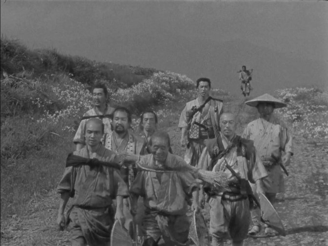 Écrit en quelques semaines et modifié à la dernière minute pour intégrer le personnage de Kikuchiyo interprété par le fou Toshiro Mifune, le scénario propose un fond mythologique destiné à être réinterprété éternellement. Dès les premières secondes d’un film qui dure pourtant plus de trois heures, la menace est posée de manière simple et inéluctable : un groupe de bandits va dépecer un village de fermiers de tous leurs biens après la prochaine moisson. Le compte à rebours a déjà commencé vers la confrontation finale. Puis vient l’introduction du samouraï en chef, interprété par le génial Takashi Shimura, un habitué de Kurosawa également présent au générique de Godzilla. Son entrée dans le film se fait via une scène d’action sans lien avec le récit principal, qui établit son caractère et démontre son humanisme et son refus des traditions. Comme le souligne le critique Roger Ebert, ce type d’introduction deviendra un passage obligé pour tout héros de film d’action. Chaque samouraï est introduit avec ce même souci d’iconographie qui établit leur caractère en quelques plans souvent silencieux. Puis vient la formation de l’équipe, les fortifications et l’entraînement des villageois, l’histoire d’amour interdite et bien sûr, la confrontation finale brutale qui demandera de nombreux sacrifices. Un schéma narratif vu et revu depuis, des Sept Mercenaires à une grande partie de l’œuvre de Sam Peckinpah, jusque chez Tarantino ou même dans des dizaines de jeux-vidéos. Et si Kurosawa n’a certainement pas tout inventé, il interprète et pose ces codes avec une telle clarté que Les Sept Samouraïs éblouit toujours par sa nouveauté.