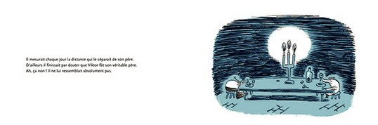 En une petite trentaine de dessins pleine page, Nicolas Mahler en dit beaucoup sur cet âge qu’il peint en noir, blanc et vert triste. Et qu’il enferme dans des espaces aux contours flous avec un trait fragile, plein de doutes. Rien de sombre ou de pathétique pourtant, mais pas mal de tendresse et d’esprit que font ressortir des textes réduits au minimum. On pense alors au Petit enfant huître et autre Fille avec plein d’yeux de Tim Burton [1], une bonne dose de poésie et d’humour grinçant en moins. Mais se rapprocher de cette merveille est déjà un sérieux gage de qualité.