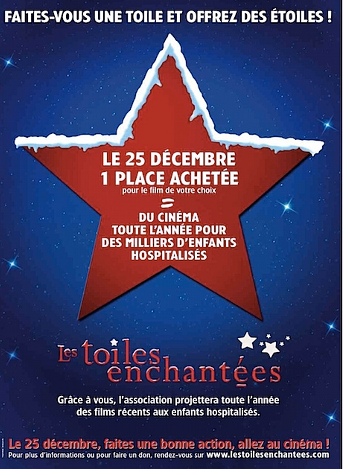 Les professionnels du cinéma et notamment les distributeurs de films ont décidé d’aider l’association Les Toiles Enchantées (soutenue par Alain Chabat) qui permet à des enfants hospitalisés d’assister à des projections de films dans leur hôpital. Pour cela, ils ont décidé de reverser une partie des recettes du samedi 25 décembre 2010 à l’association. Pour une place achetée, une partie des recettes reviendra donc à l’association qui pourra ainsi rendre les jours de ces enfants moins mornes.