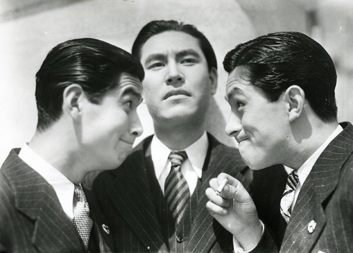 Notre avis : Plus ou moins inspiré de la comédie musicale Die drei von der Tankstelle - Le chemin du Paradis de Wilhelm Thiele (1930), konyaku sanbagarasu - Les trois prétendants est représentatif du style international qui caractérise nombre de films des années 30. Le Japon qu’on voit à l’écran est occidentalisé à l’extrême et les grands décors blancs sont dignes d’une production UFA ou Paramount, en particulier celui du magasin de mode où les trois héros sont engagés (dans le film de Thiele, ils s’occupaient d’une station service). On le croirait sorti d’un film de Lubitsch ou de La Cava, auxquels on songe irrésistiblement lors de la scène très drôle où Ken Uehara, sommé d’attirer des clients, provoque un attroupement devant la vitrine en faisant mine d’observer attentivement quelque chose dans le ciel avant d’entrainer tout le monde à l’intérieur.