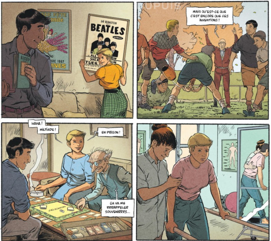 Le style de Horne joue bien évidemment de cette ambivalence. Les personnages y sont tous représentés avec des traits assez sympathiques, ainsi, même le contremaître qui suit le voleur de l’usine de tuiles n’a pas un faciès si dérangeant. Bien sûr, les entraîneurs un peu trop conservateurs sont un poil exagérés dans leur expression, mais Miltiade l’est tout autant dans son style « vieux fou ». Après les émotions à fleur de peau du premier tome, on sent qu’une attention particulière a été donnée pour suivre l’évolution, de la jalousie, de la peur, de l’attente de certains des protagonistes, avec Yveline et Monique comme piliers de cette ligne que représente le village entier.
